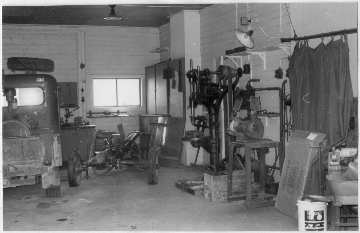 Vägförvaltningen i Västernorrlands län, VFY, Byggnadsförrådet. Interiör från verkstadsbyggnad. Liten lastbil (paketbil), pelarborr, slipmaskin, verktyg.
