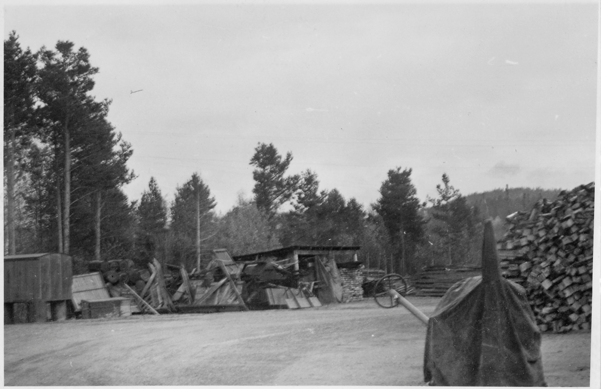Vägstation Z3, Brunflo. Baksidan av vägstationen med förrådsbyggnad och upplag av diverse material, ved med mera.