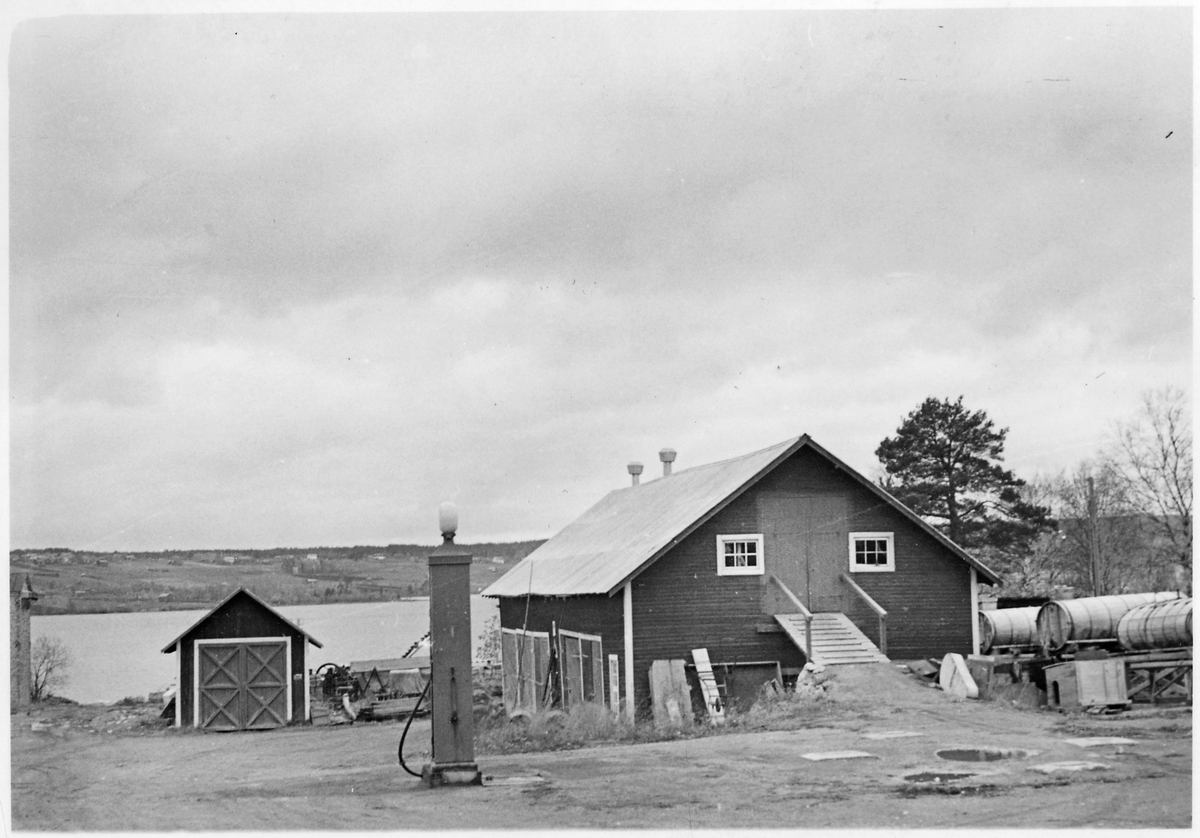 Vägstation Z3, Brunflo. Förrådsbyggnader. Förrådsbyggnad i två plan med uppfartsramp. Upplag av diverse material och väghållningsmaskiner, bland annat luttunnor. Bensinpump (drivmedelspump). Utsikt mot Storsjön/Brunfloviken.