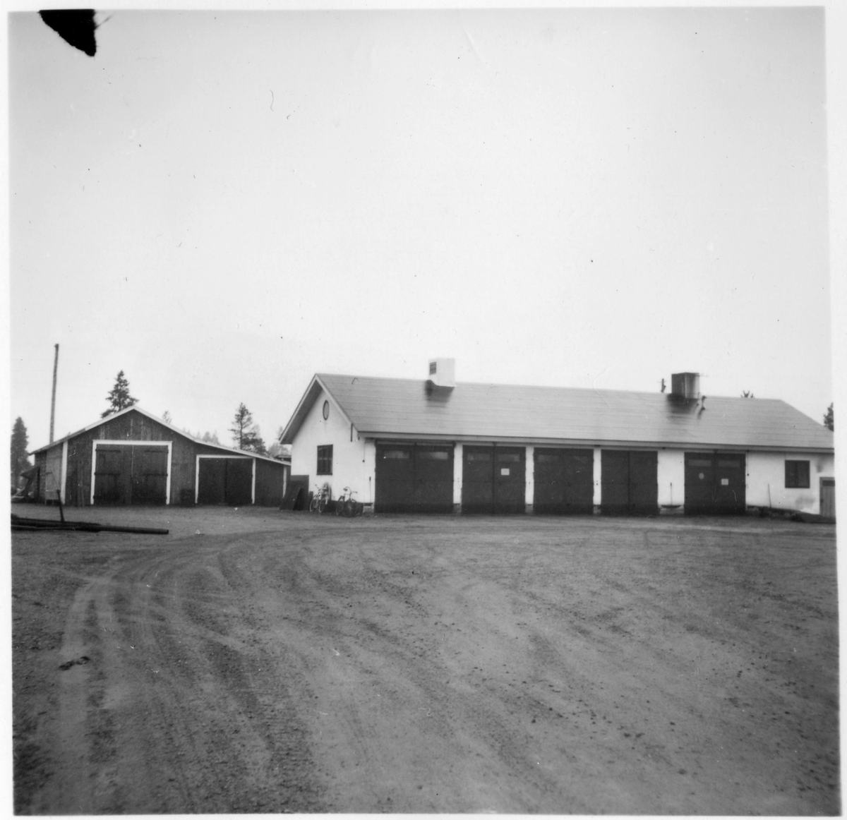 Vägstation BD20, Arjeplog. Vägstationens huvudbyggnad. Garage och verkstad. Eventuellt kontor i bortre delen. Förrådsbyggnad till vänster. Cyklar vid gaveln.