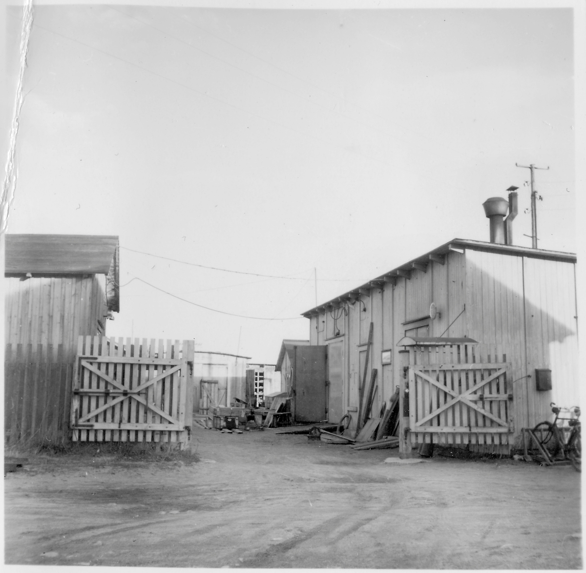 Kvarteret Stören, Luleå. Förrådsbyggnader, innanför trägrind. Upplag av diverse materiel runt byggnaderna. Cykelställ med cykel utanför grinden.