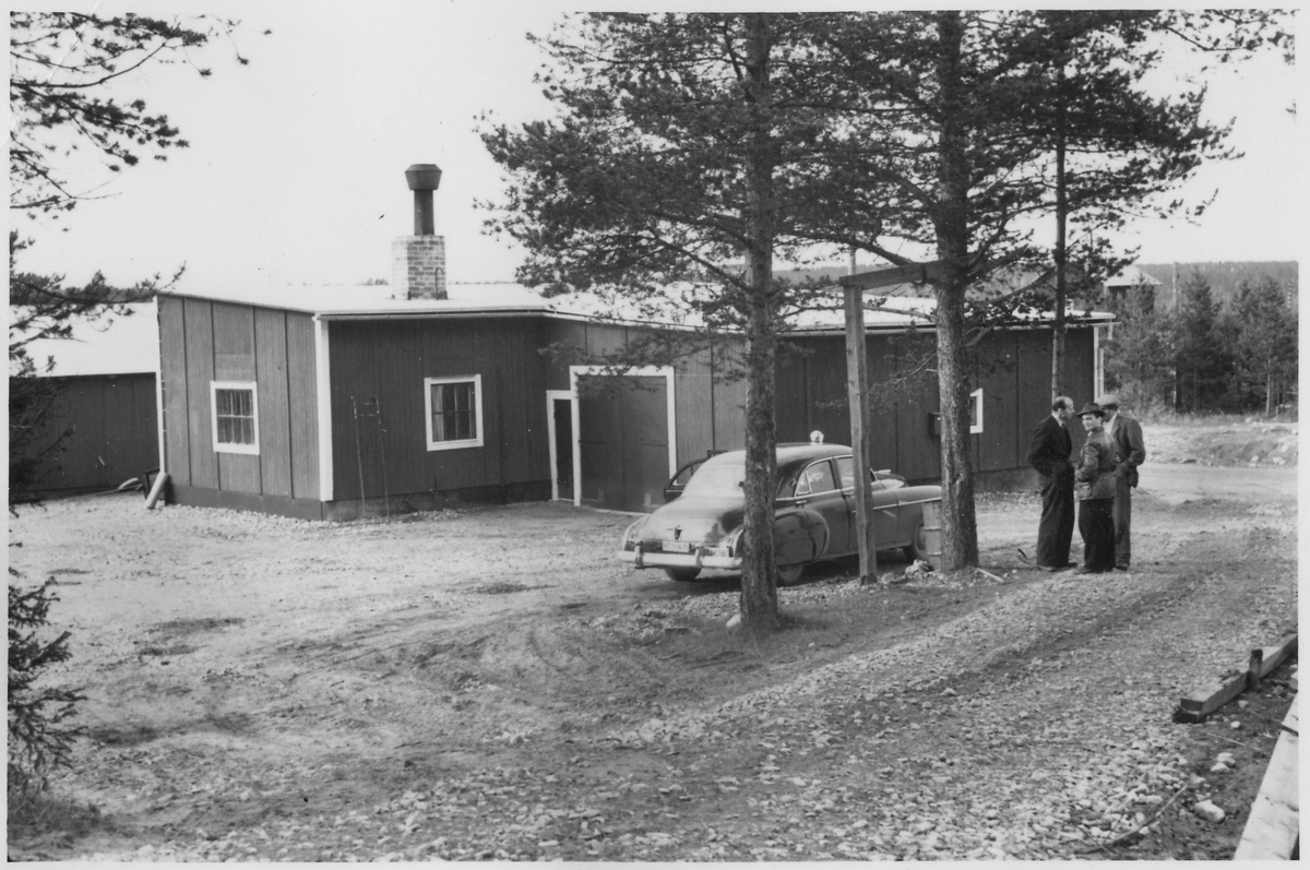 Byggnadsförrådet i VFBD (Vägstation VFBD7, Kalix). Kontors- och förrådsbyggnad. Framför byggnaden personbil och grupp med manspersoner.