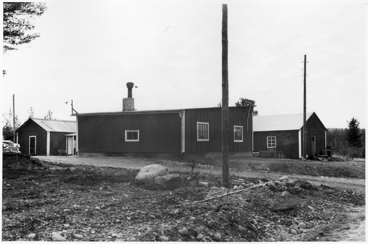 Byggnadsförrådet i VFBD (Vägstation VFBD7, Kalix). Förrådsbyggnader. Till vänster eventuell kontors- och manskapsbyggnad. Personbil skymtar till vänster.