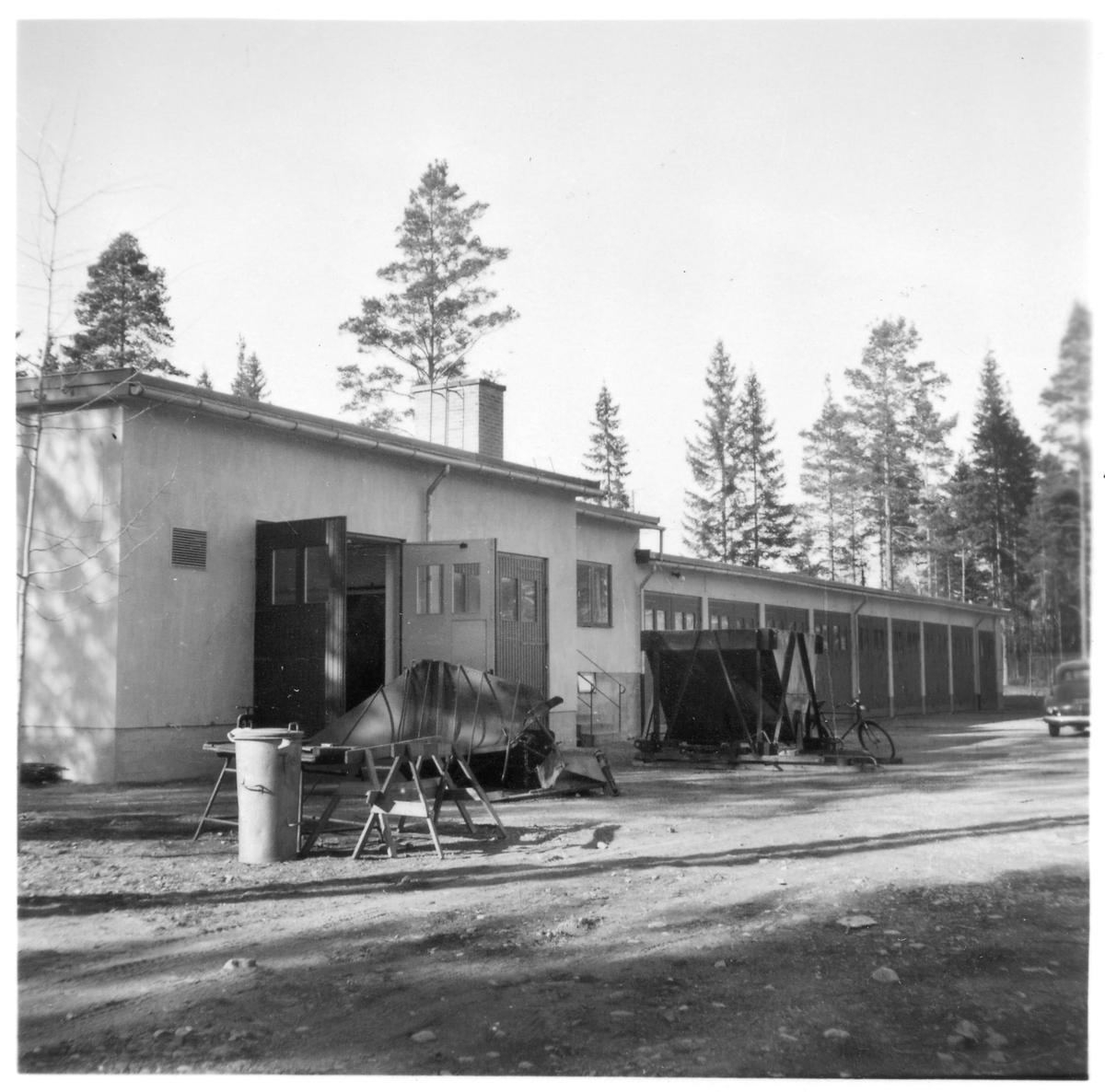 Vägstation H9, Nybro. Vägstationens huvudbyggnad med verkstadsdel, kontorsdel och garagedel. Soptunna framför verkstaden.