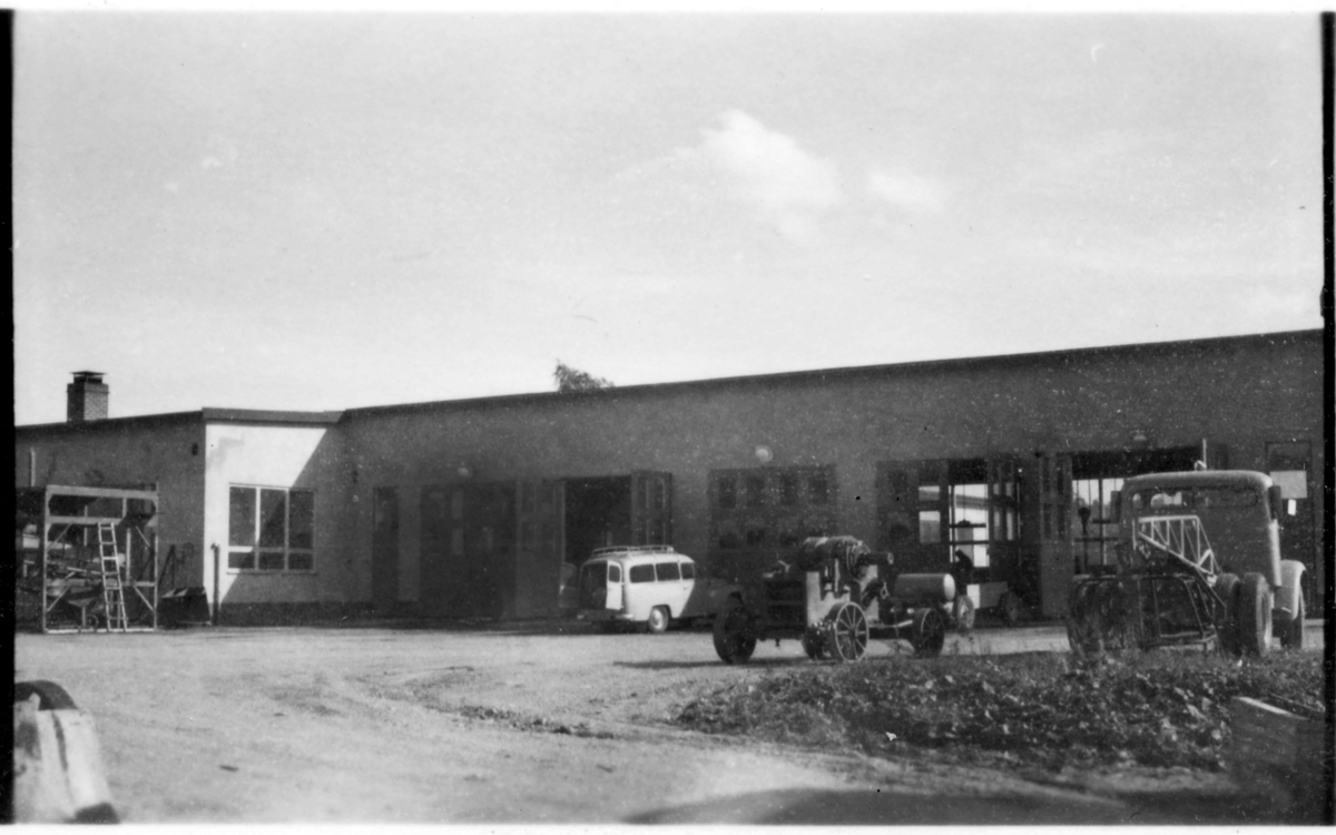 Vägstation D5, Flen. Huvudbyggnaden med Depåverkstaden till höger. Framför verkstadsdörrarna en Volvo Duett, stenkross och lastbil (utan flak).