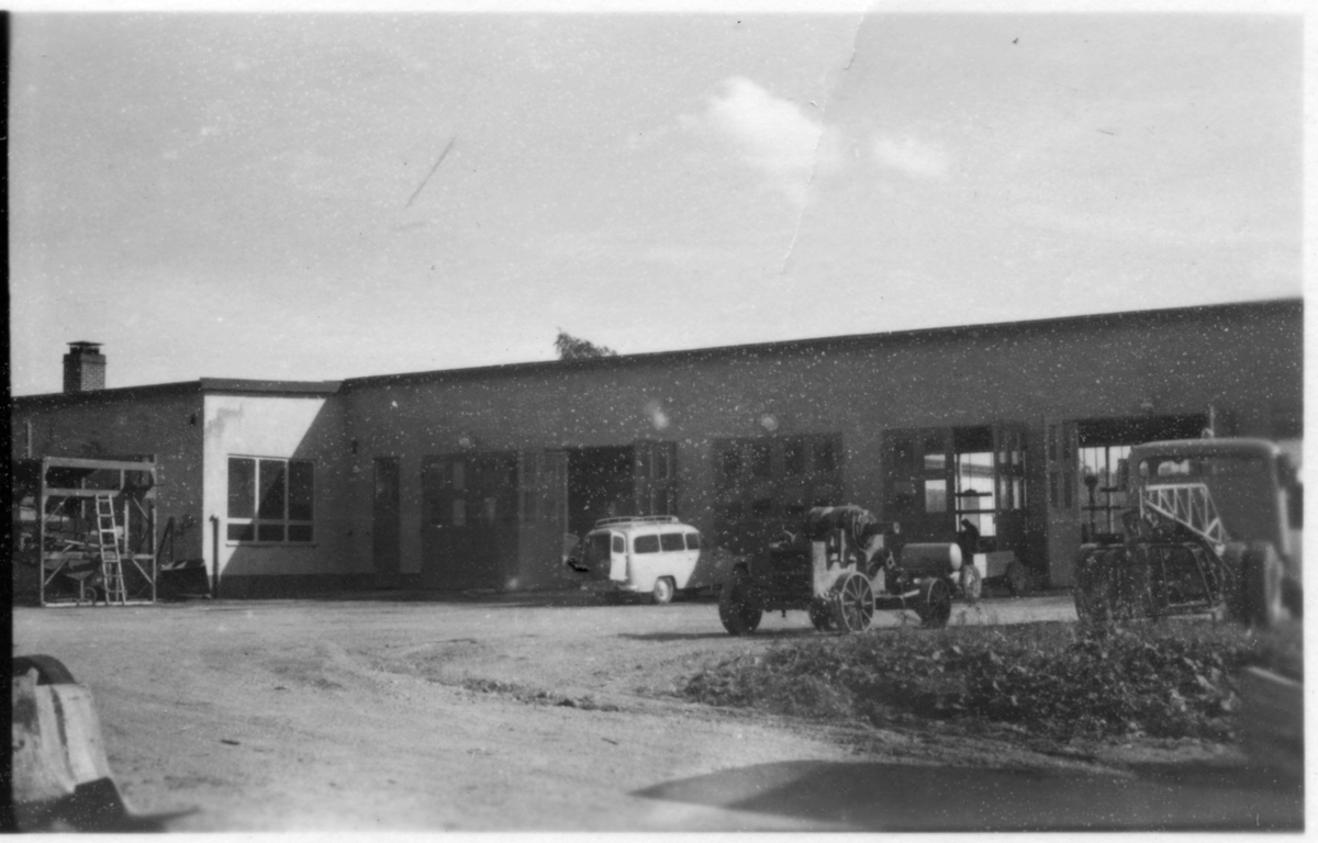 Vägstation D5, Flen. Huvudbyggnaden med Depåverkstaden till höger. Framför verkstadsdörrarna en Volvo Duett, stenkross och lastbil (utan flak).