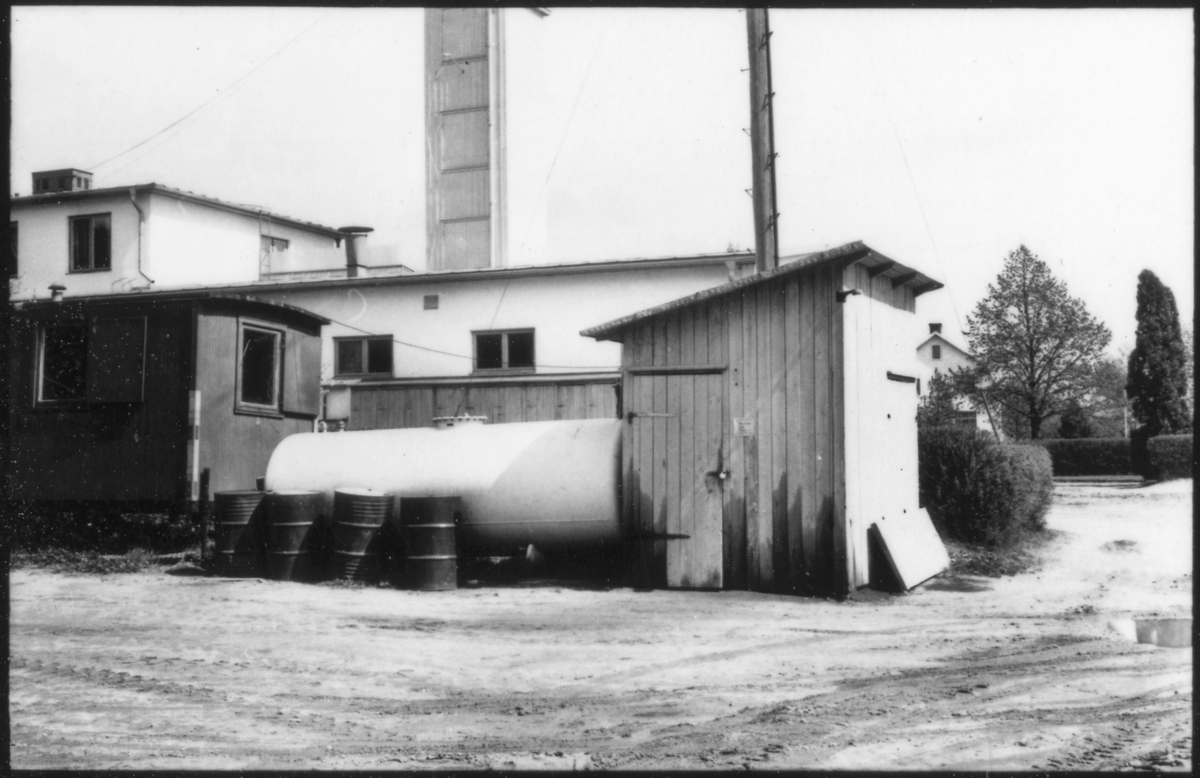 Vägstation T1, Pålsboda, filial Odensbacken. Förrådsbyggnader, i bakgrunden garagebyggnaden. Bränsletank, "farmartank" och bränslefat.