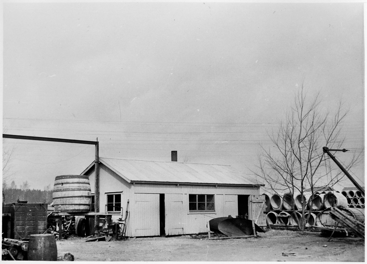Vägstation T2, Askersund. Förrådsbyggnad. Framför byggnaden spetsplog, vattentunna av trä, upplag av cementrör, vinsch (lyftkran).