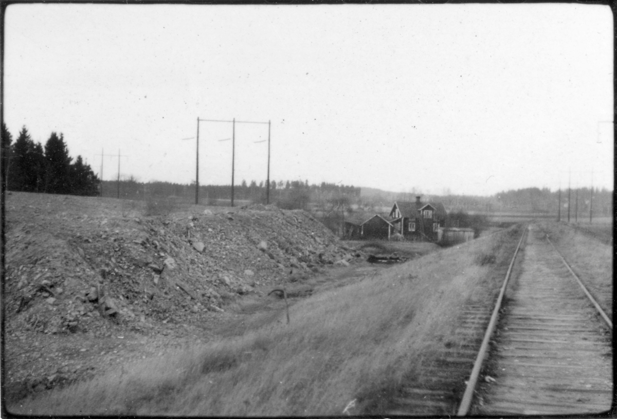 Vägstation T3, Hallsberg. Stenupplaget i Tälle. Sten- och grushög. Järnvägsspår löper vid sidan om. Bostadshus i bakgrunden.