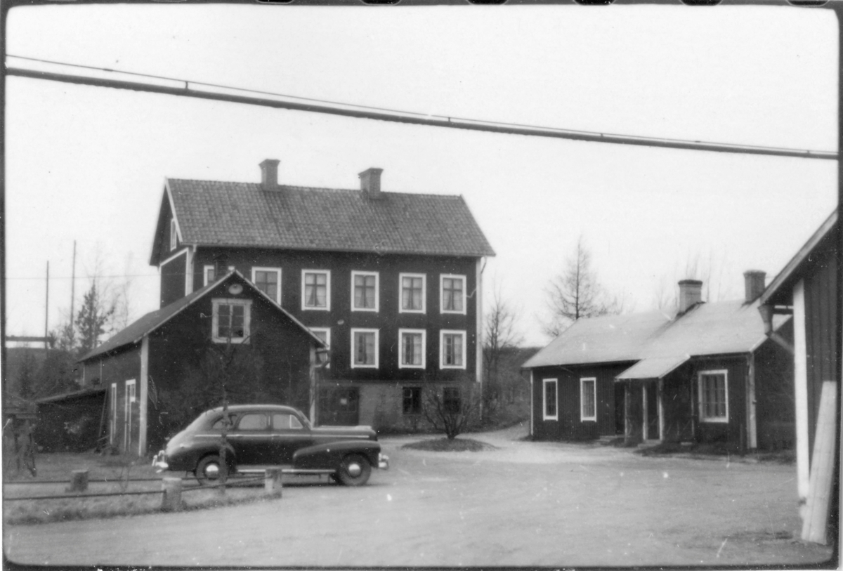 Vägstation T5, Ånstaberg. Tjänstebostadshus för vägstationens personal. Till vänster uthus till bostadshuset. Personbil framför uthuset.