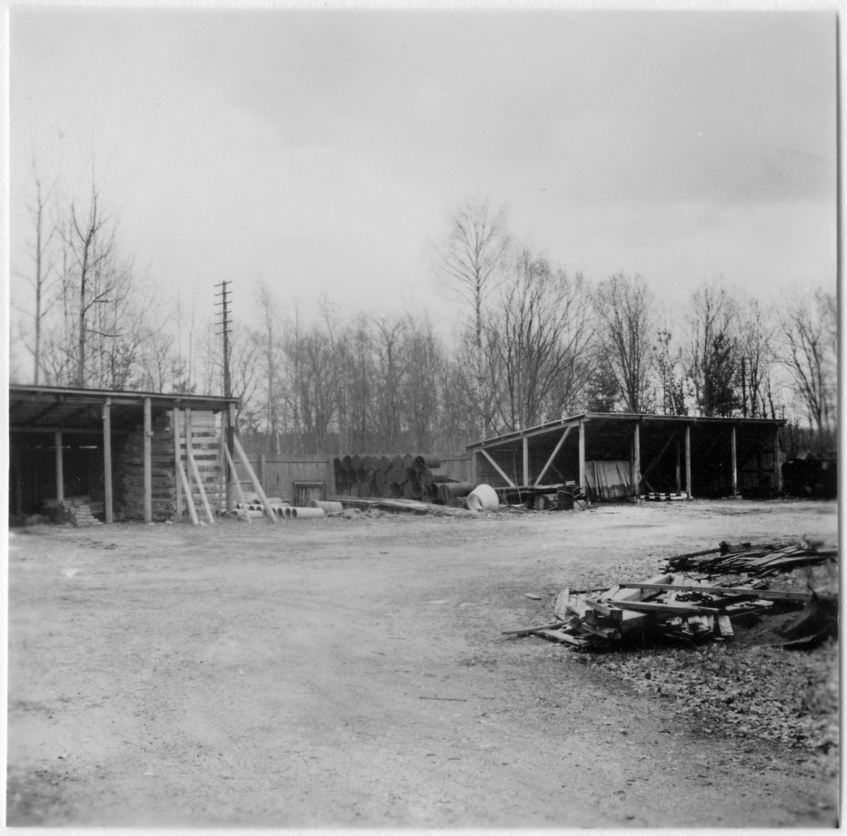 Depåförrådet i Ånstaberg (Vägstation T5). Förrådsbyggnad, öppna skjul med diverse material. Upplag av bränslefat mellan byggnaderna.