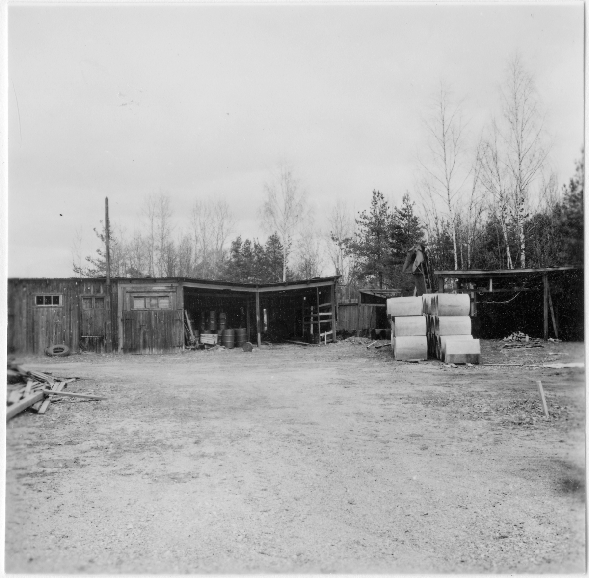 Depåförrådet i Ånstaberg (Vägstation T5). Förrådsbyggnader, öppet skjul. Upplag av cementrör.