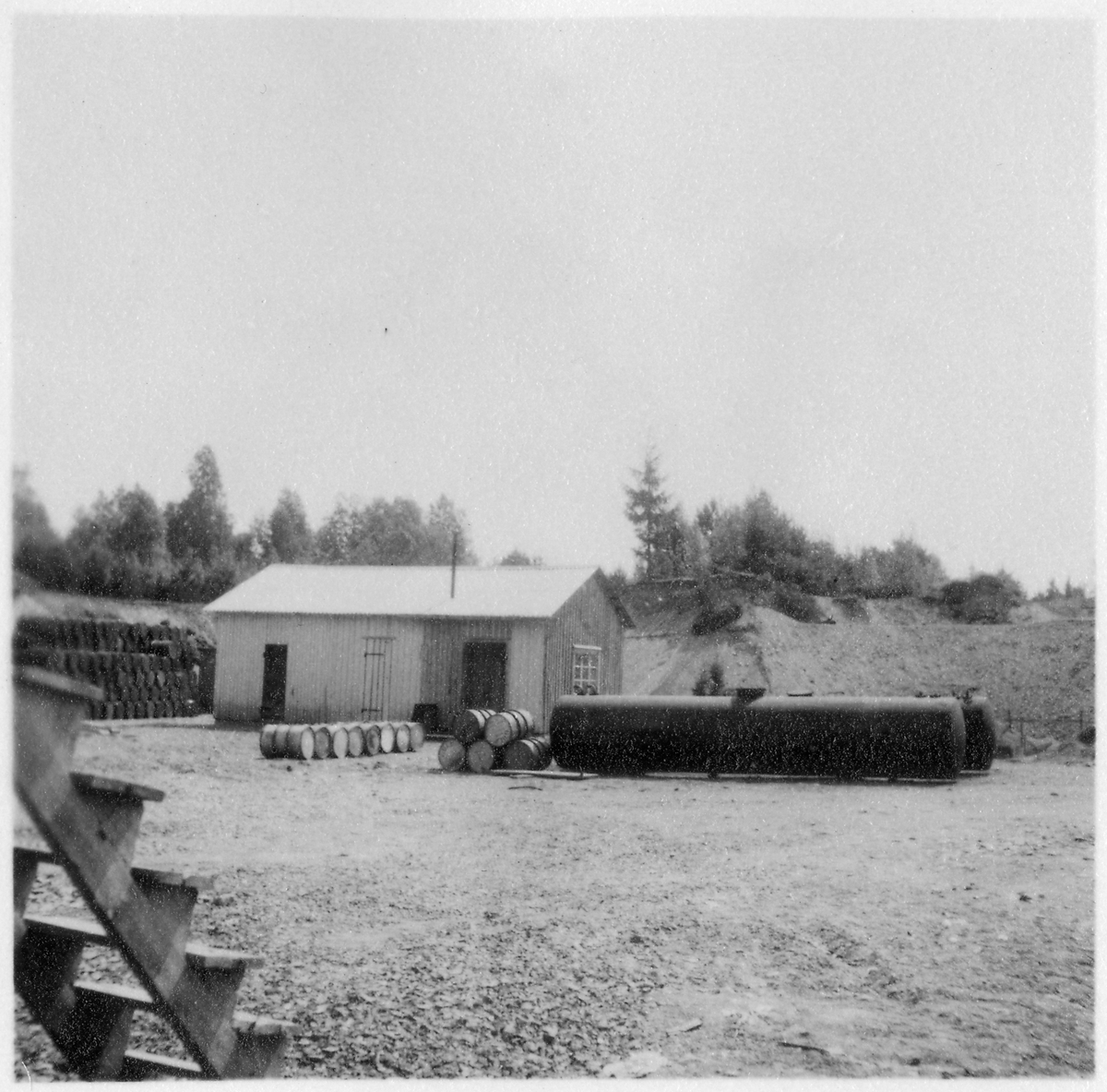 Vägstation T8, Grythyttan. Vägstationens grusgrop med förrådsbyggnad, två oljecisterner, upplag av bränslefat.