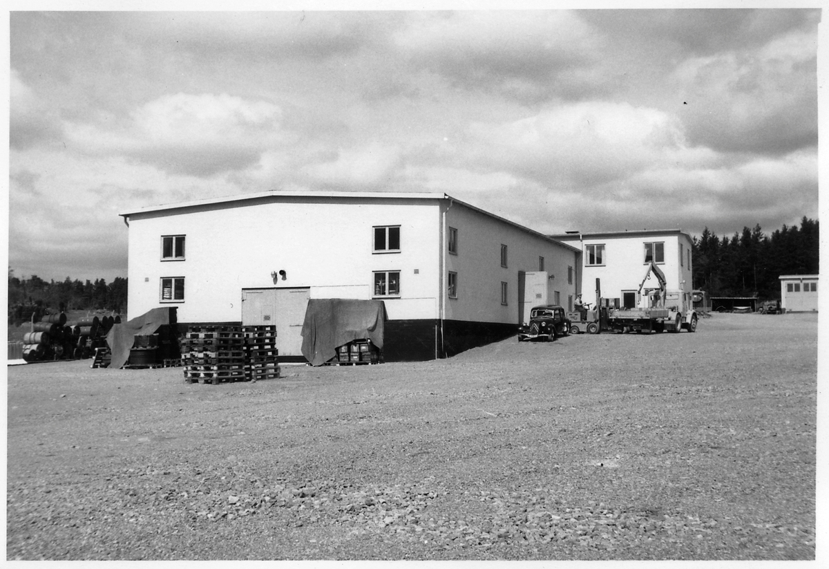 Vägstation B4, Knivsta. Huvudbyggnaden. Lastbil med lastkran, gaffeltruck, personbil Citroën 11 CV.