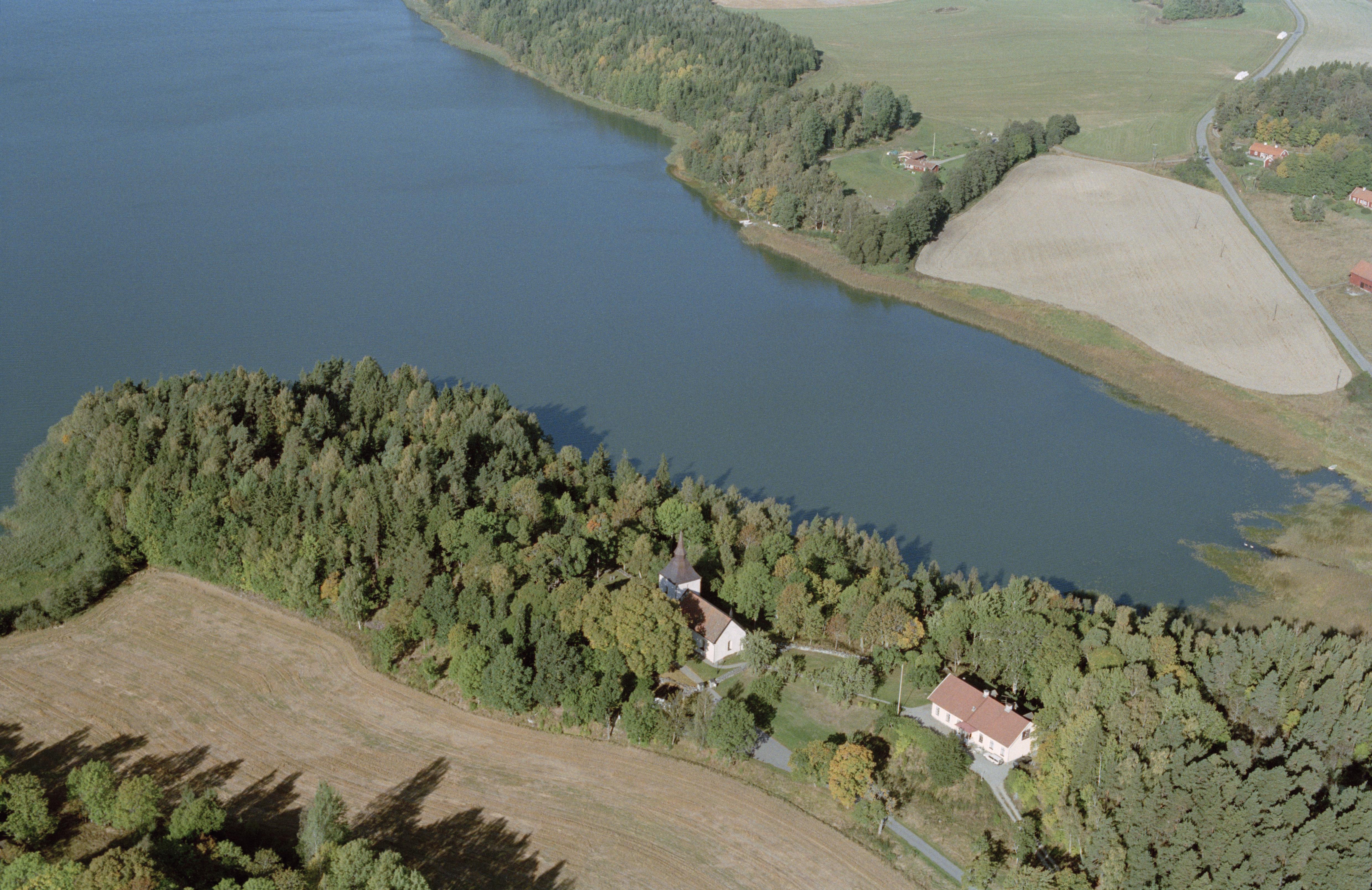 Bogsta kyrka vid sjön Runnviken. Bilden är tagen mot (väderstreck): NV