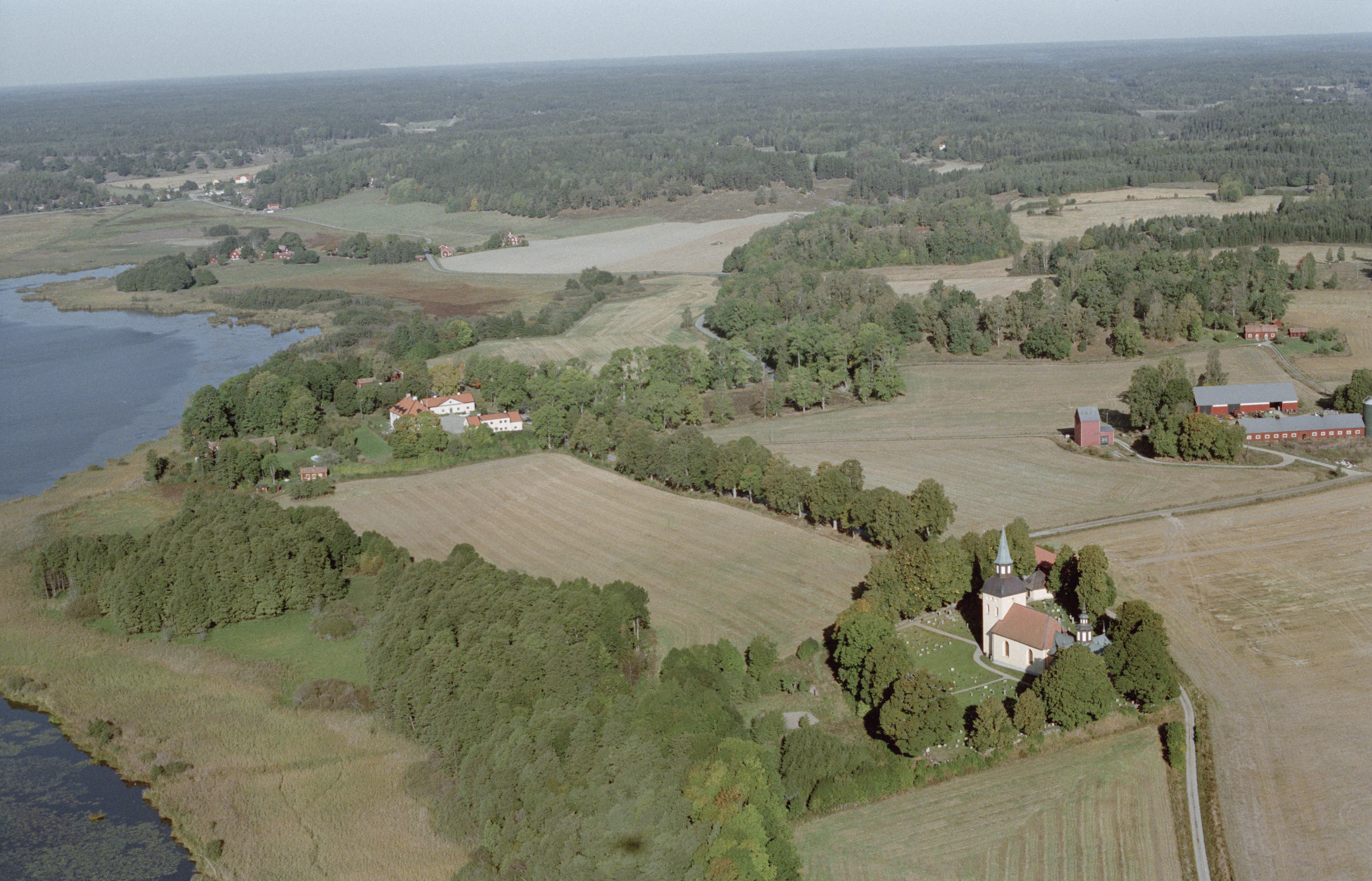 Ludgo kyrka, Trollesunds herrgård vid Ludgosjön till vänster om bildens mitt. Bilden är tagen mot (väderstreck): NV