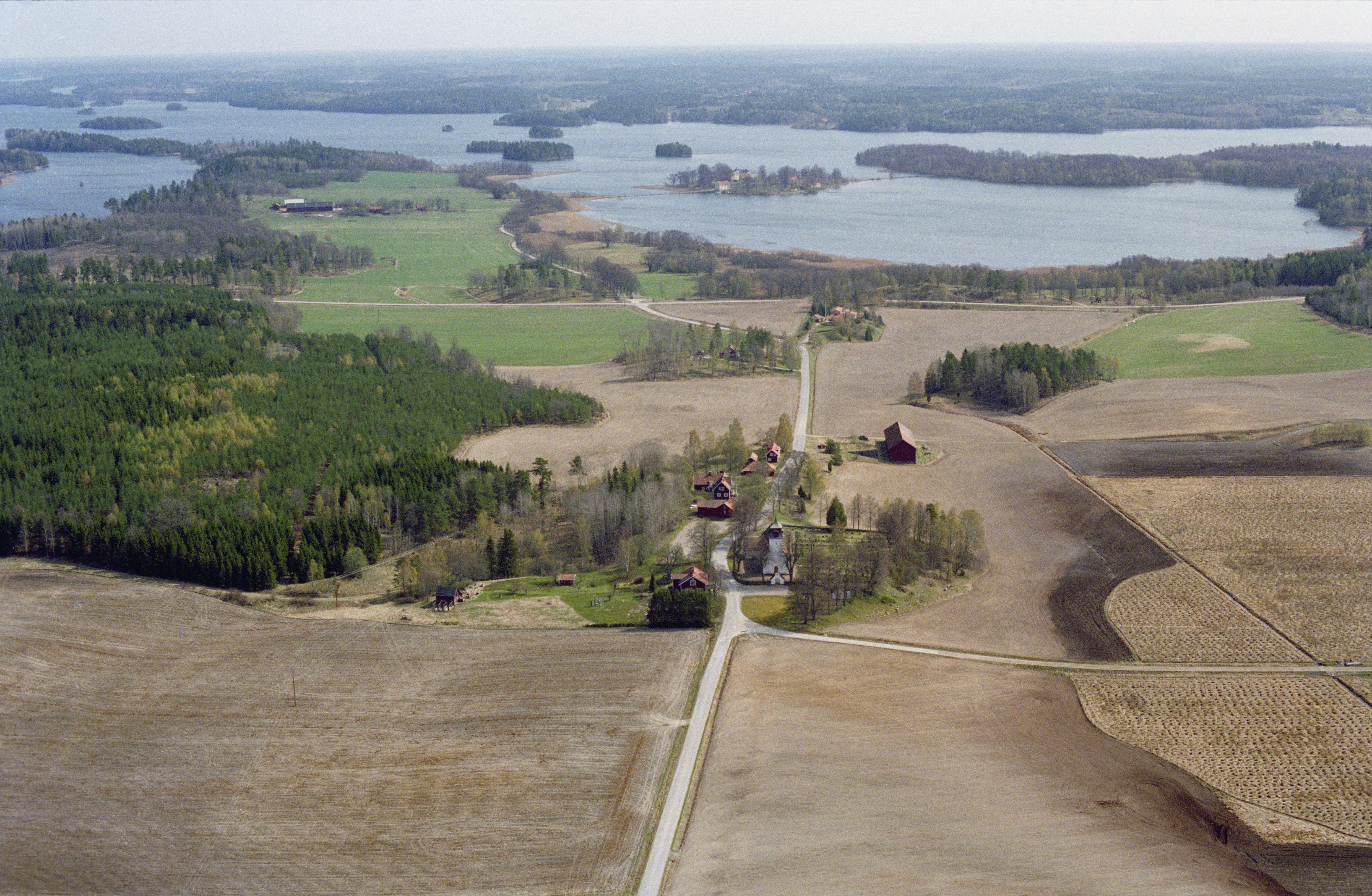 Årdala kyrka. I bildens övre del Vibyholms slott RAÄnr Årdala 123:1 och till höger Djurön sjön Båven. Bilden är tagen mot (väderstreck): OSO