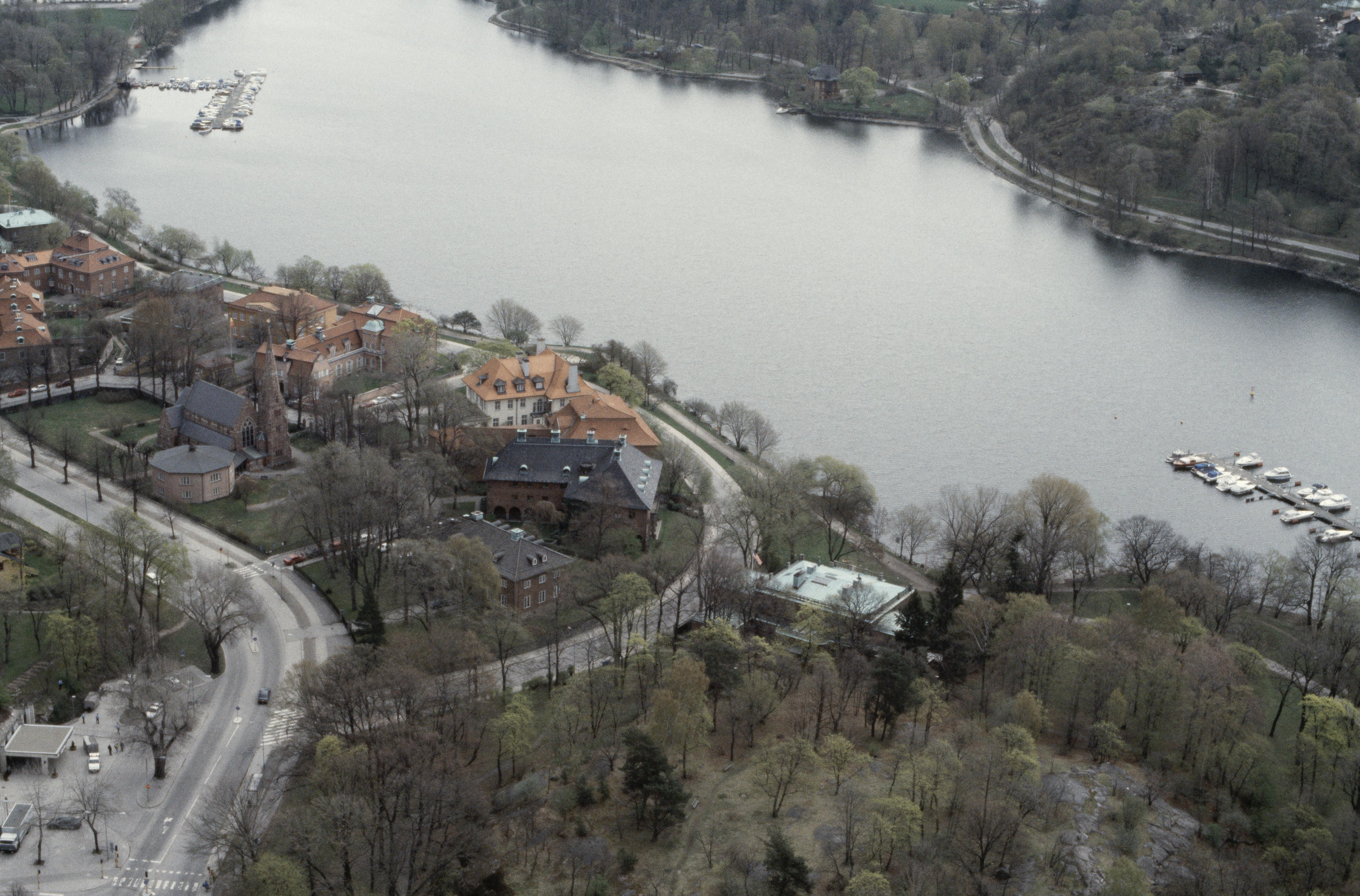 Ladugårdsgärdet. Diplomatstaden vid Djurgårdsbrunnsviken. Engelska kyrkan till vänster om bildens mitt. Bilden är tagen mot (väderstreck): Ö