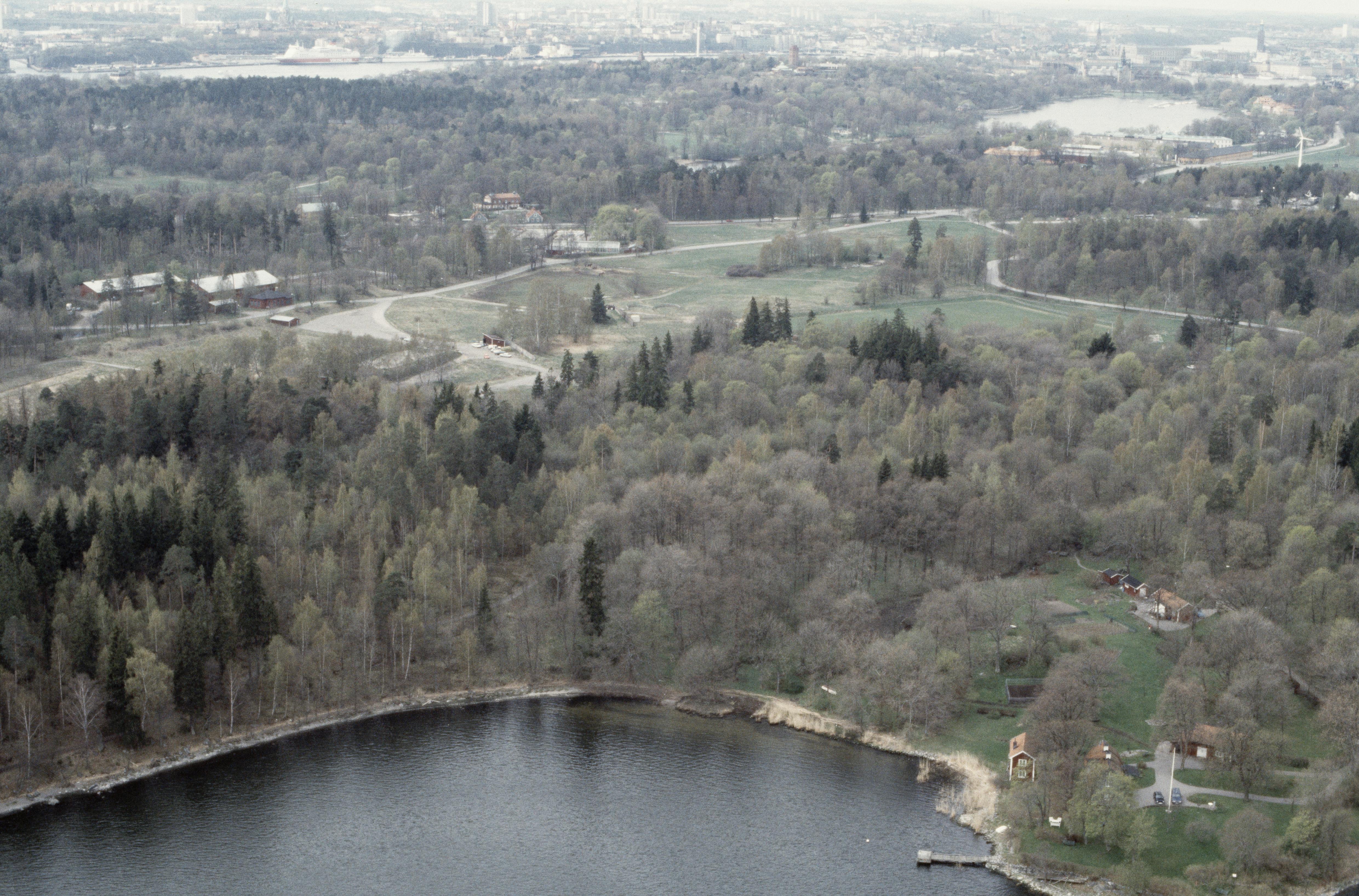 Ladugårdsgärdet. Kaknäs och Kaknäshagen. Vid bildens mitt gravfält RAÄnr Stockholm 7:1. Bilden är tagen mot (väderstreck): SV