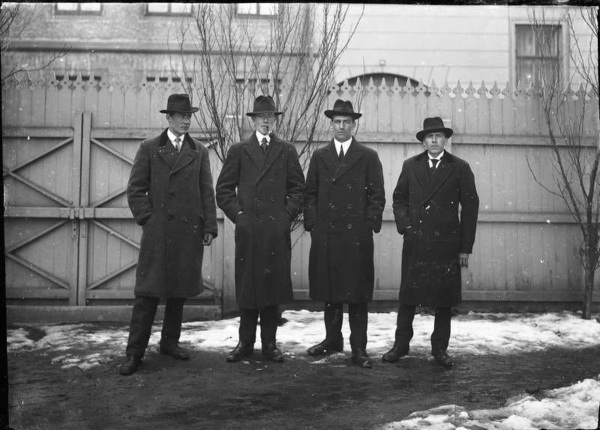 Titel: Fyra herrar framför ett plank.