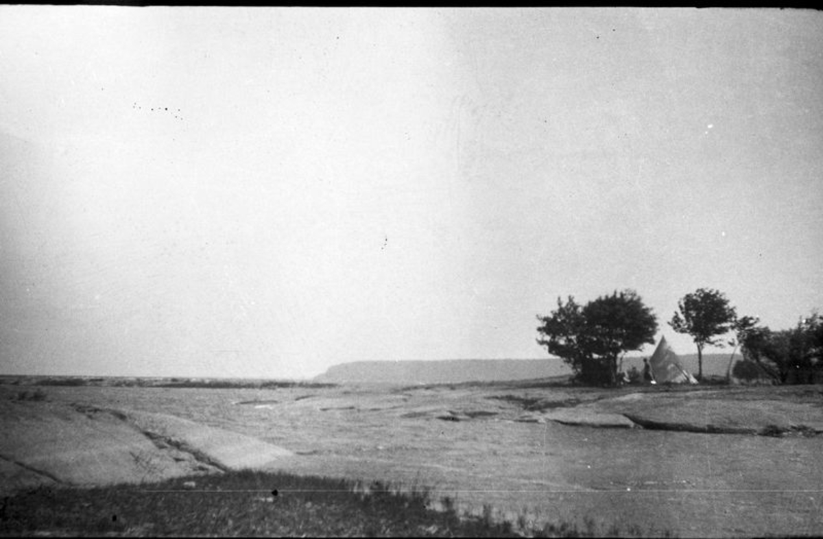Holmen AnnaStina med tält, vy mot Halleberg. Vänersborg
