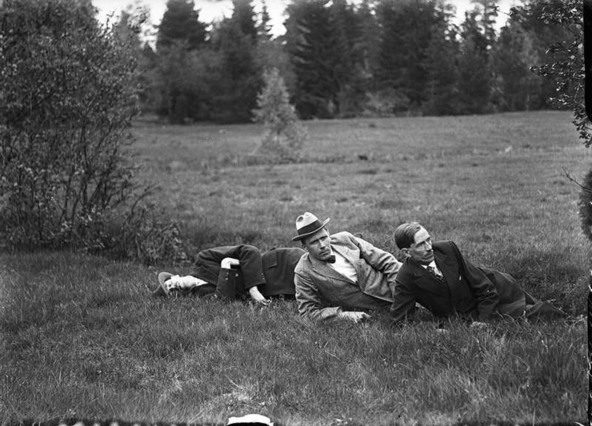 Tre män ligger i gräset.