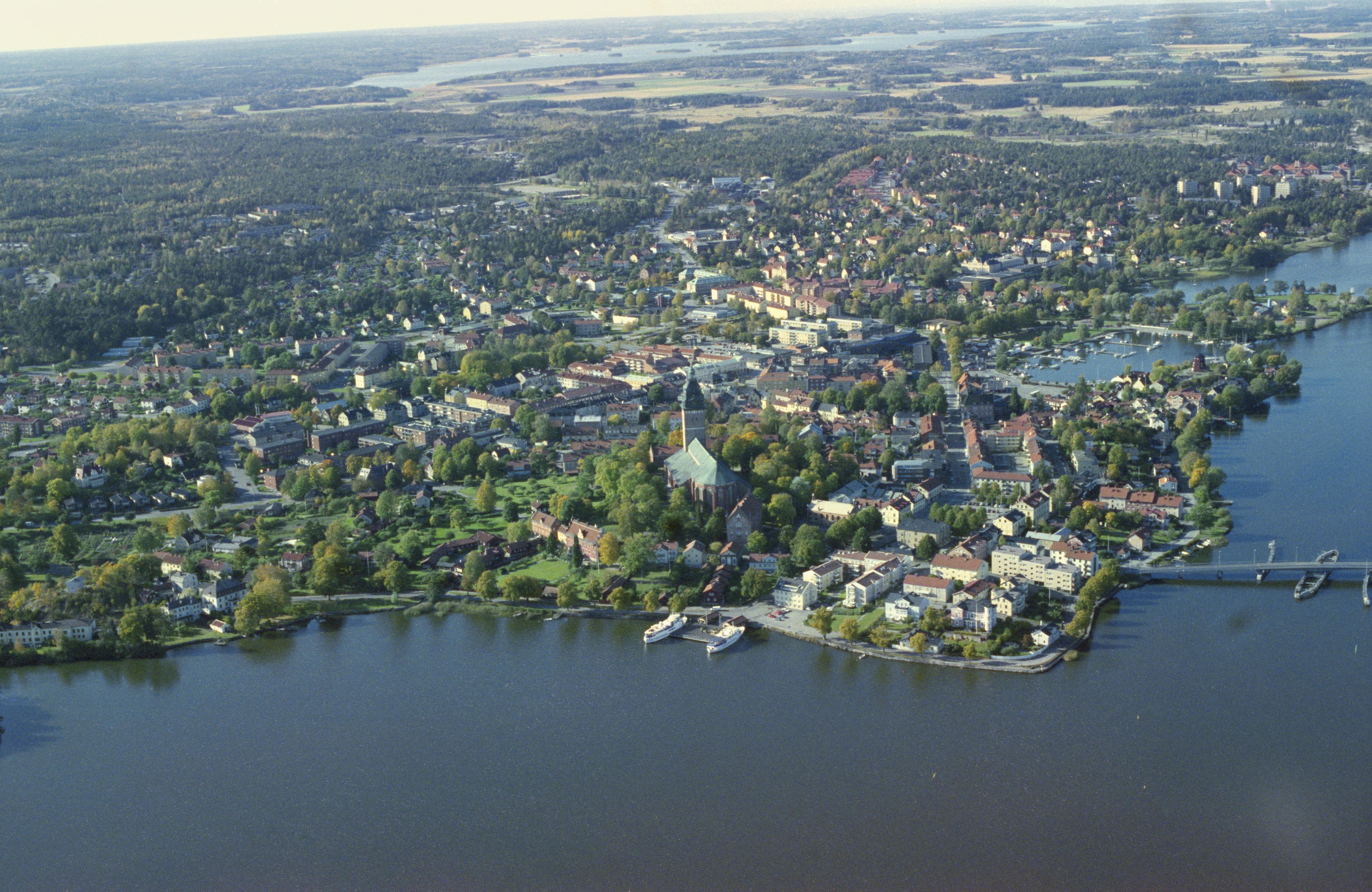 Strängnäs stad. Strängnäs domkyrka vid bildens mitt. Bilden är tagen mot (väderstreck): VNV