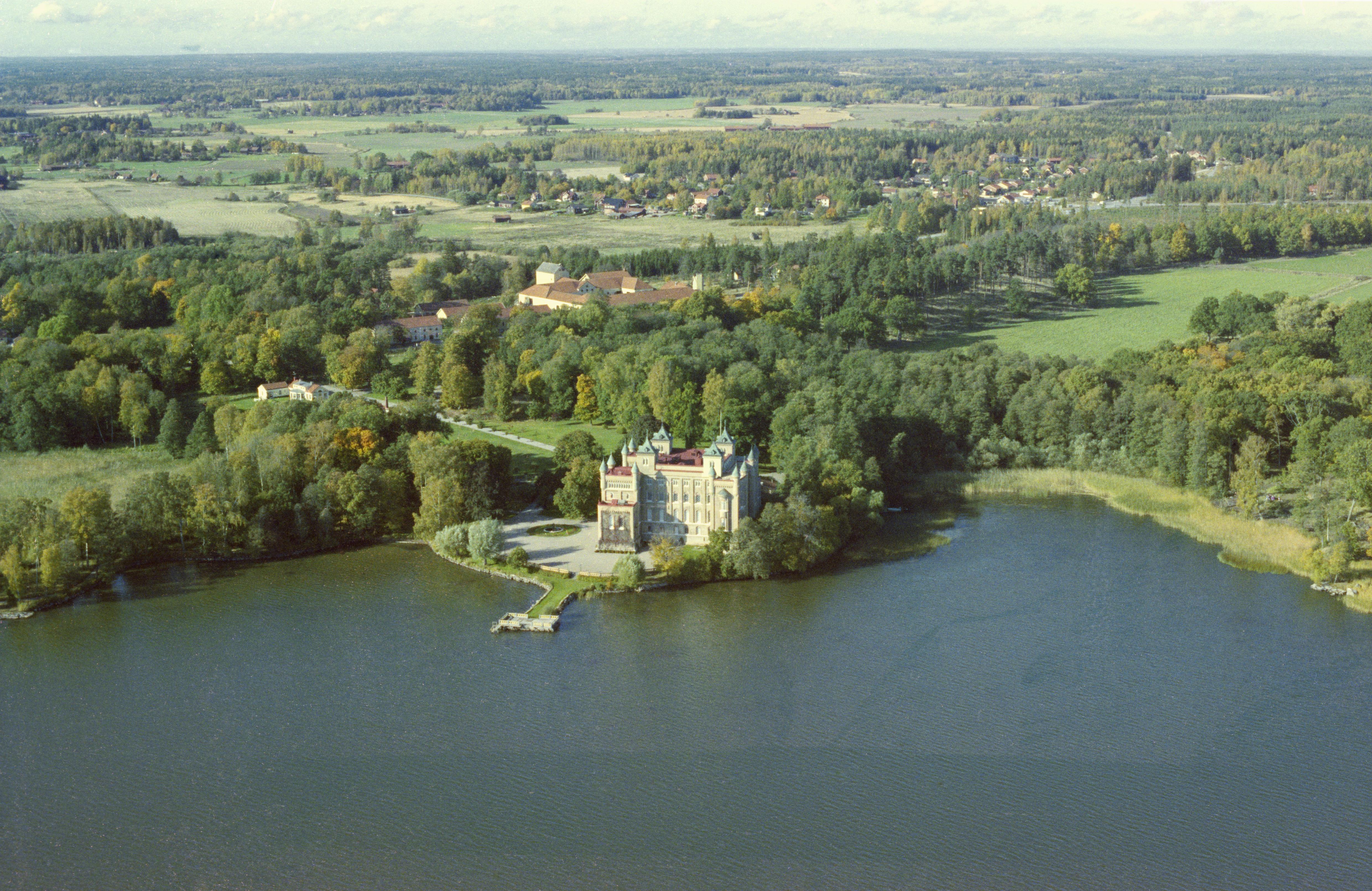 Stora Sundby slott, byggnadsminne RAÄnr Öja 58:1, vid Slottsviken i norröstra delen av sjön Hjälmaren. I bildens övre del Alberga tätort vid gränsen mot Västermo socken. Bilden är tagen mot (väderstreck): NV