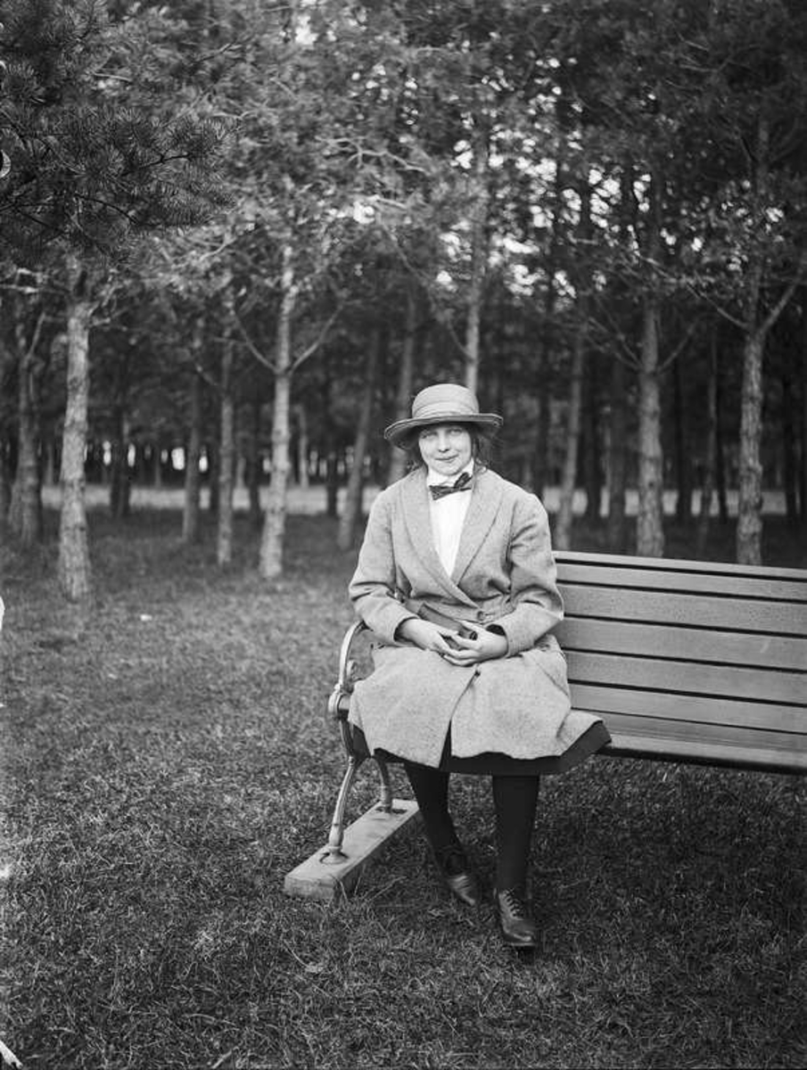 Kvinna på parkbänk. Möjligen på Skräcklan i Vänersborg.