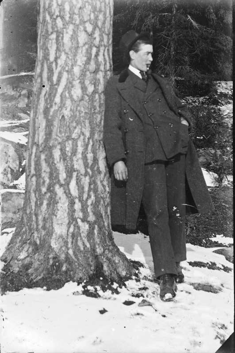 Ung herre poserar vid ett träd.