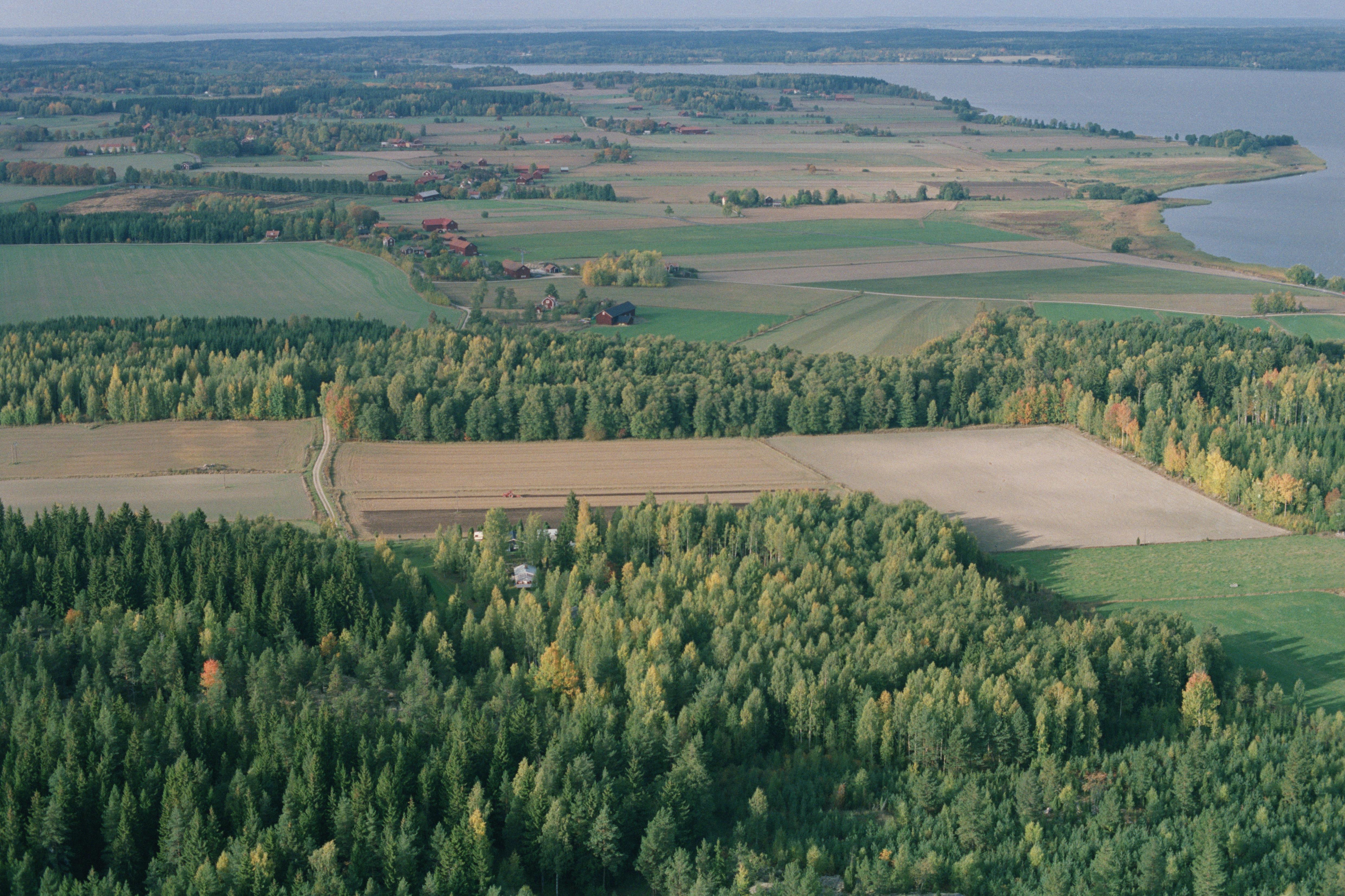 Hulla by vid sjön Öljaren. Till vänster om bildens mitt fyndplats (stenyxor) RAÄnr Österåker 3:1 i Hulla by vid Gärsån. Uppe till vänster Österåkers kyrkby. Bilden är tagen mot (väderstreck): N