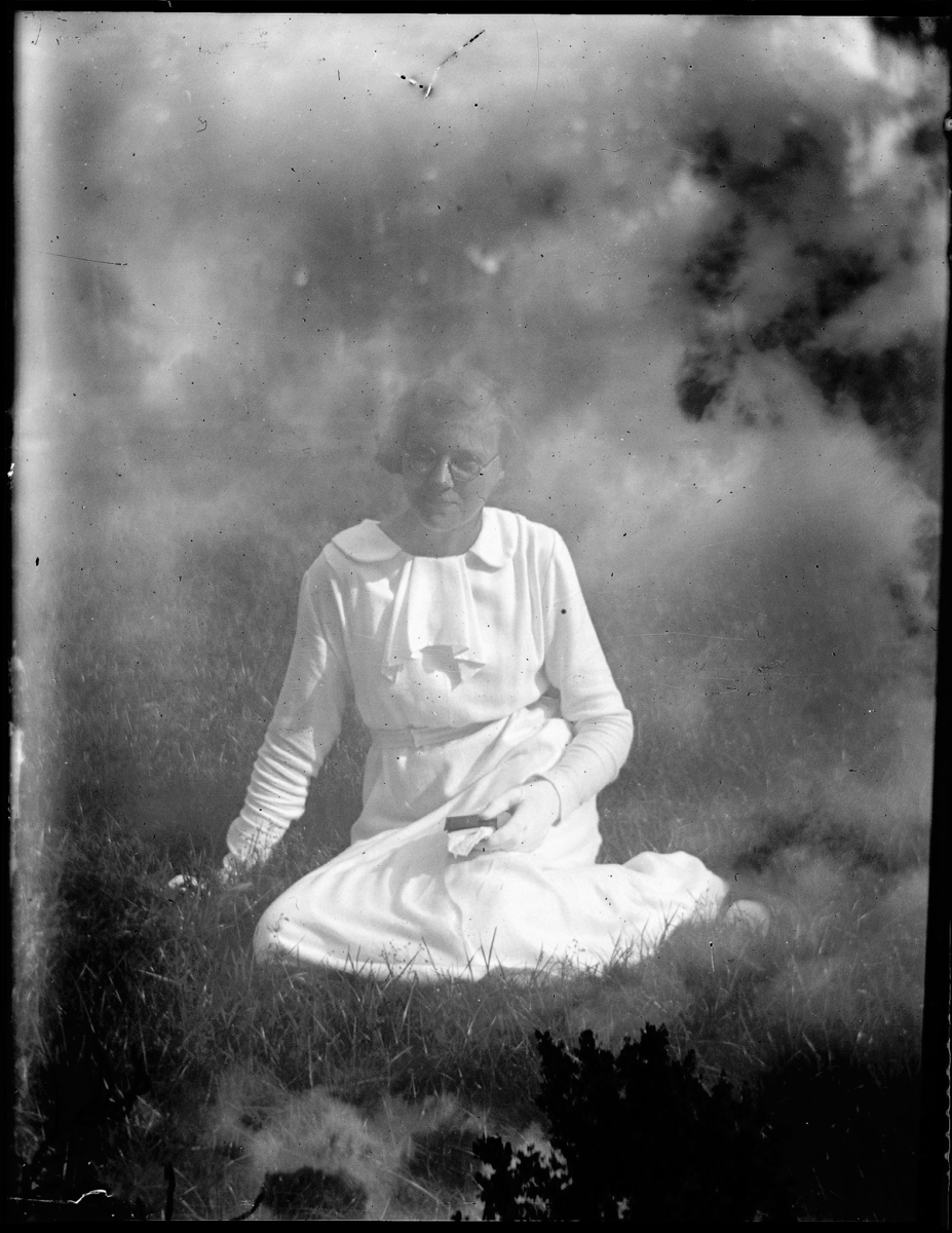 Sommarbild i trädgården. Britta i konfirmationsklänning.