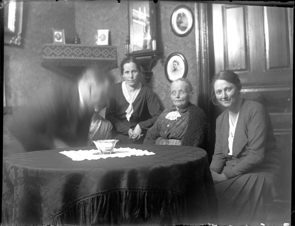 Vid bordet i ett rum i Farmors hus: Farmor, Lisa, Märta och (jag suddig).