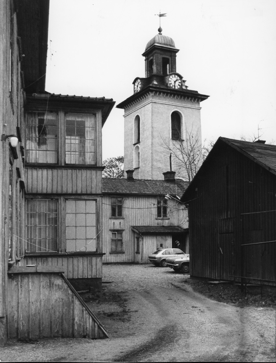 Alingsås. Gårdsplan med trähus. Kyrkan i bakgrunden