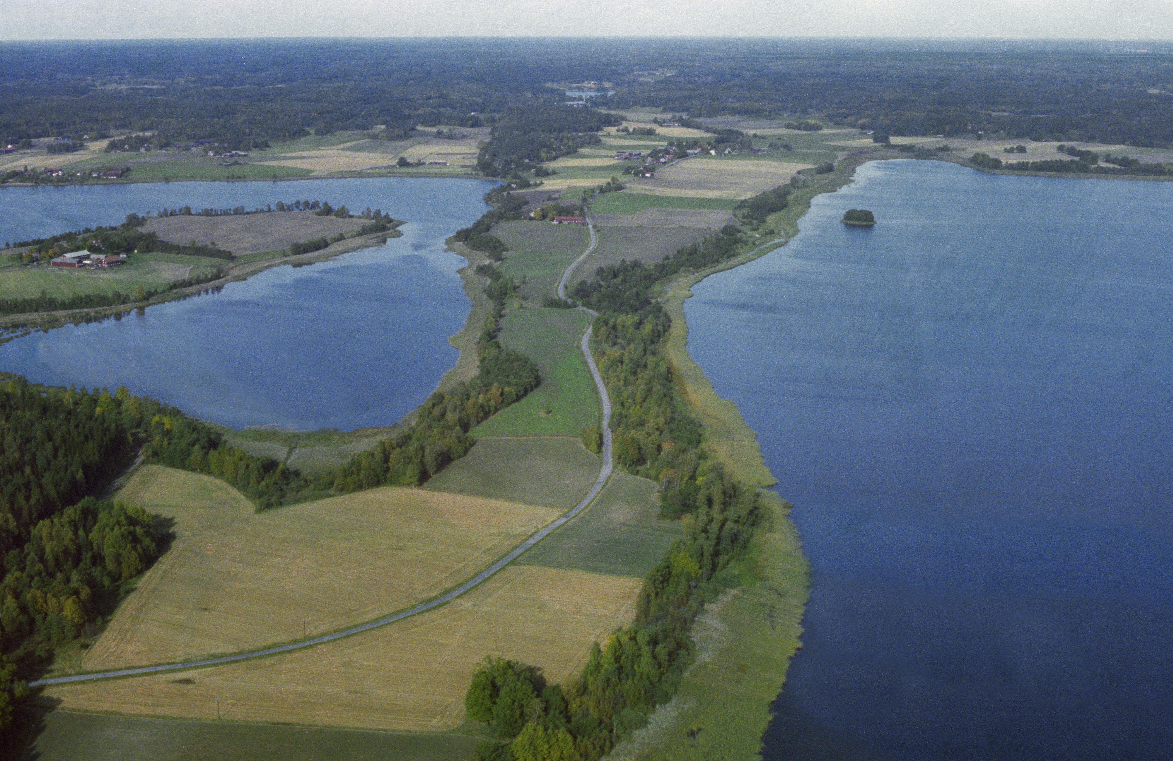 Blacksta by mellan Avlasjön och Nyckelsjön. Vid bildens mitt fossil åker RAÄnr Gåsinge-Dillnäs 423:1 söder om Ullsta gård. På udden uppe till vänster Rynäs gård. Bilden är tagen mot (väderstreck): NV