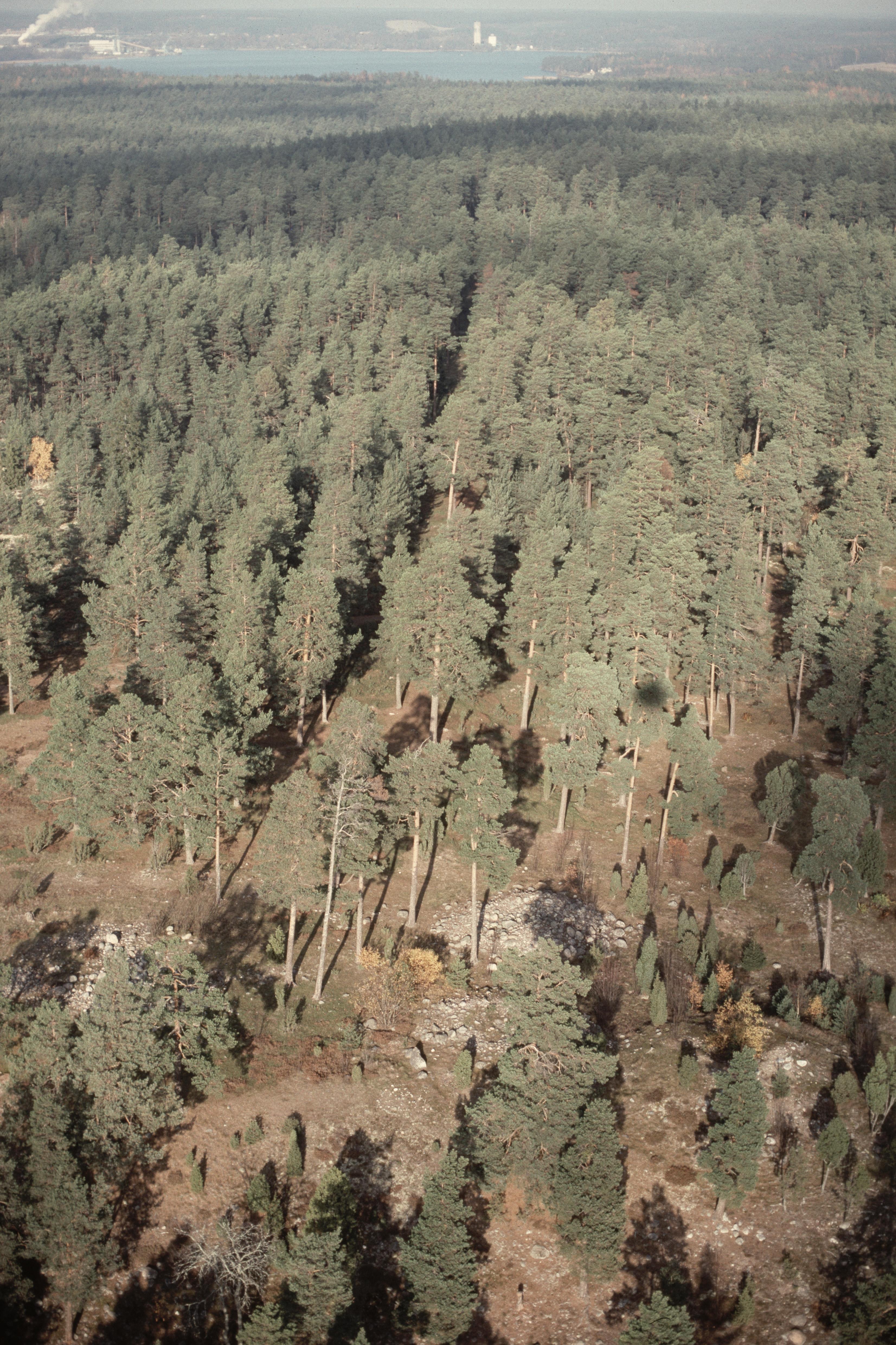 Rösaringsåsen. I bildens nedre del gravfält RAÄnr Låssa 23:1. I bildens övre del färdväg (Rösarings processionsväg) RAÄnr Låssa 85:1 mot Kalmarviken i Mälaren. Bilden är tagen mot (väderstreck): N