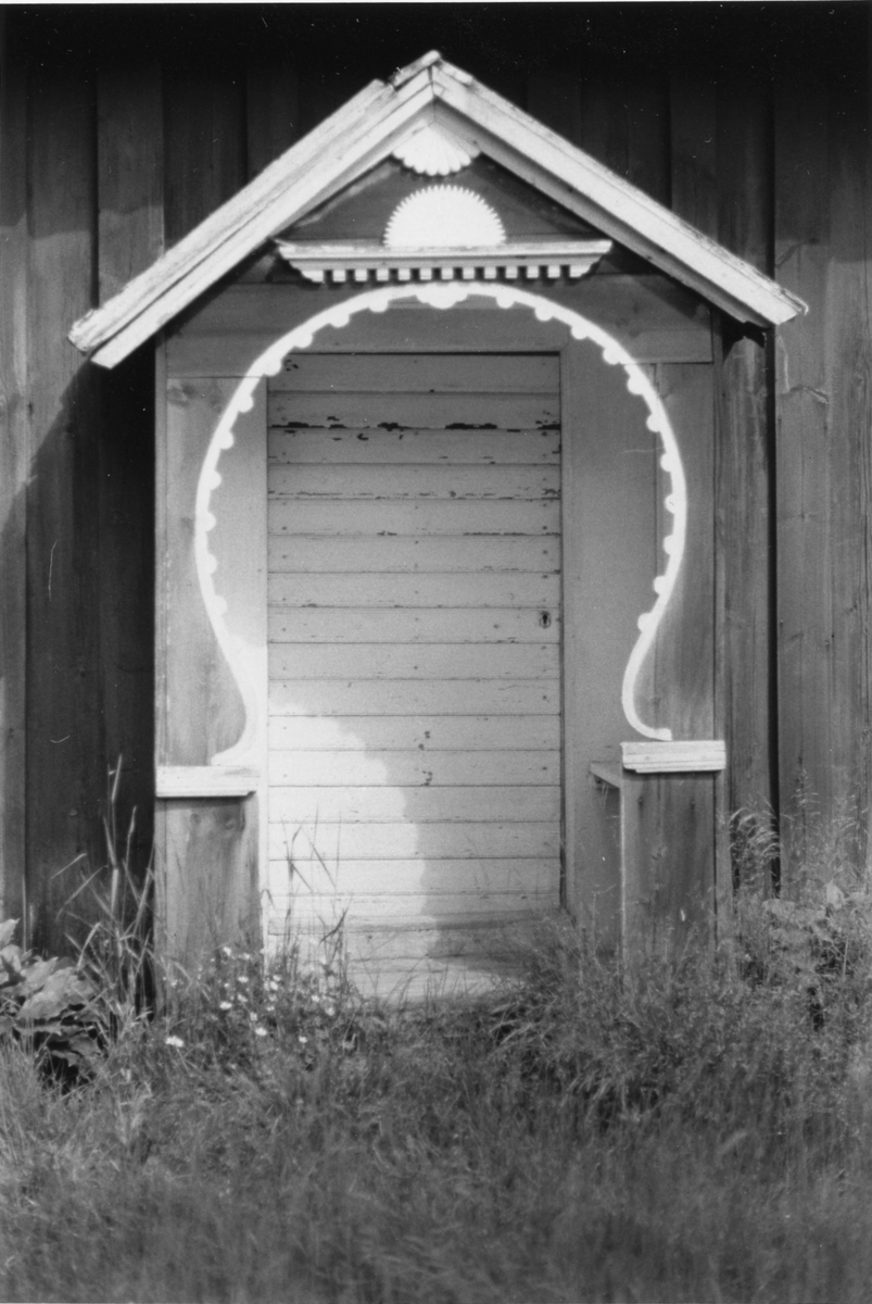 Denna nyckelhålsveranda har till skillnad från den i Bollebygd, flera vitmålade dekorationer. Sadeltaket är spånklätt.