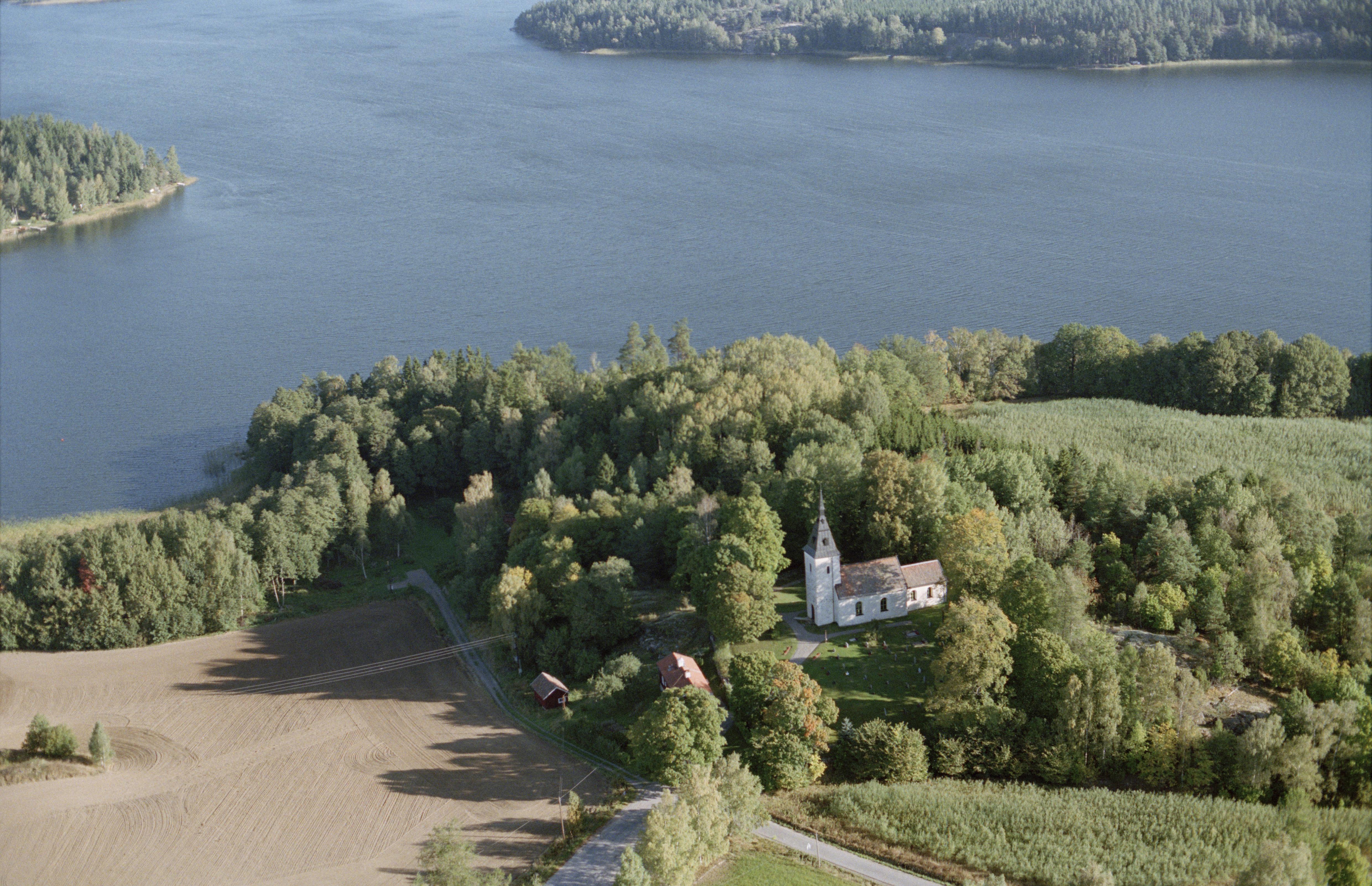 Kattnäs kyrka vid Klövstafjärden i södra delen av sjön Klämmingen. Bilden är tagen mot (väderstreck): N