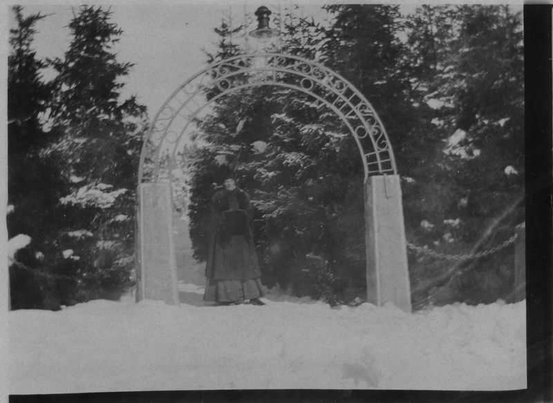 Ingång till Skräckleparken från Edsgatan. Under portalen fröken Amalia Ullman, syster till musikdirektör Elis Ullman, Skräcklan Vänersborg