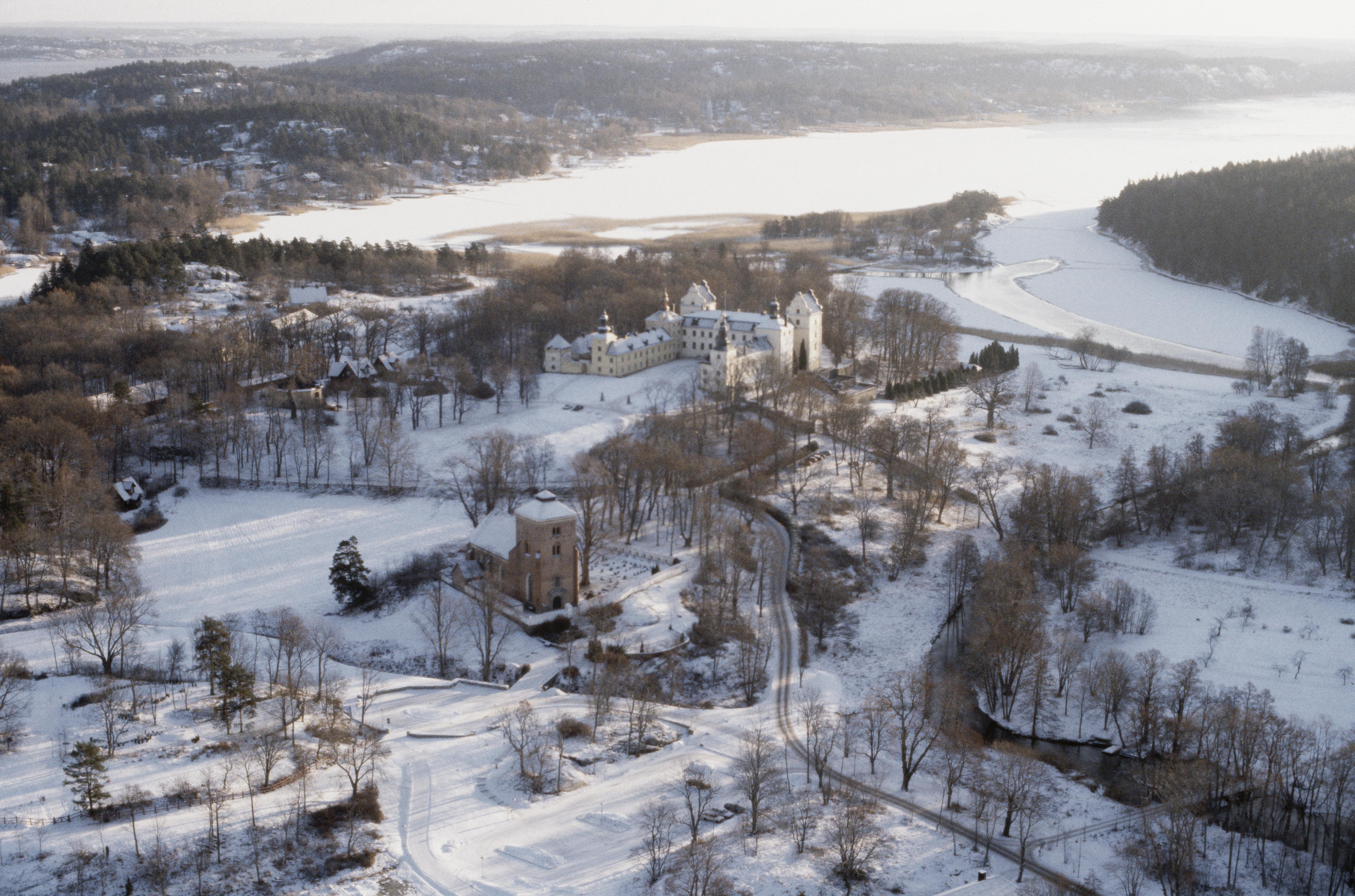 Tyresö kyrka och Tyresö slott (byggnadsminne RAÄnr Tyresö 37:1) vid Kalvfjärden. Erstaviken uppe i bildens vänstra hörn. Bilden är tagen mot (väderstreck): Ö