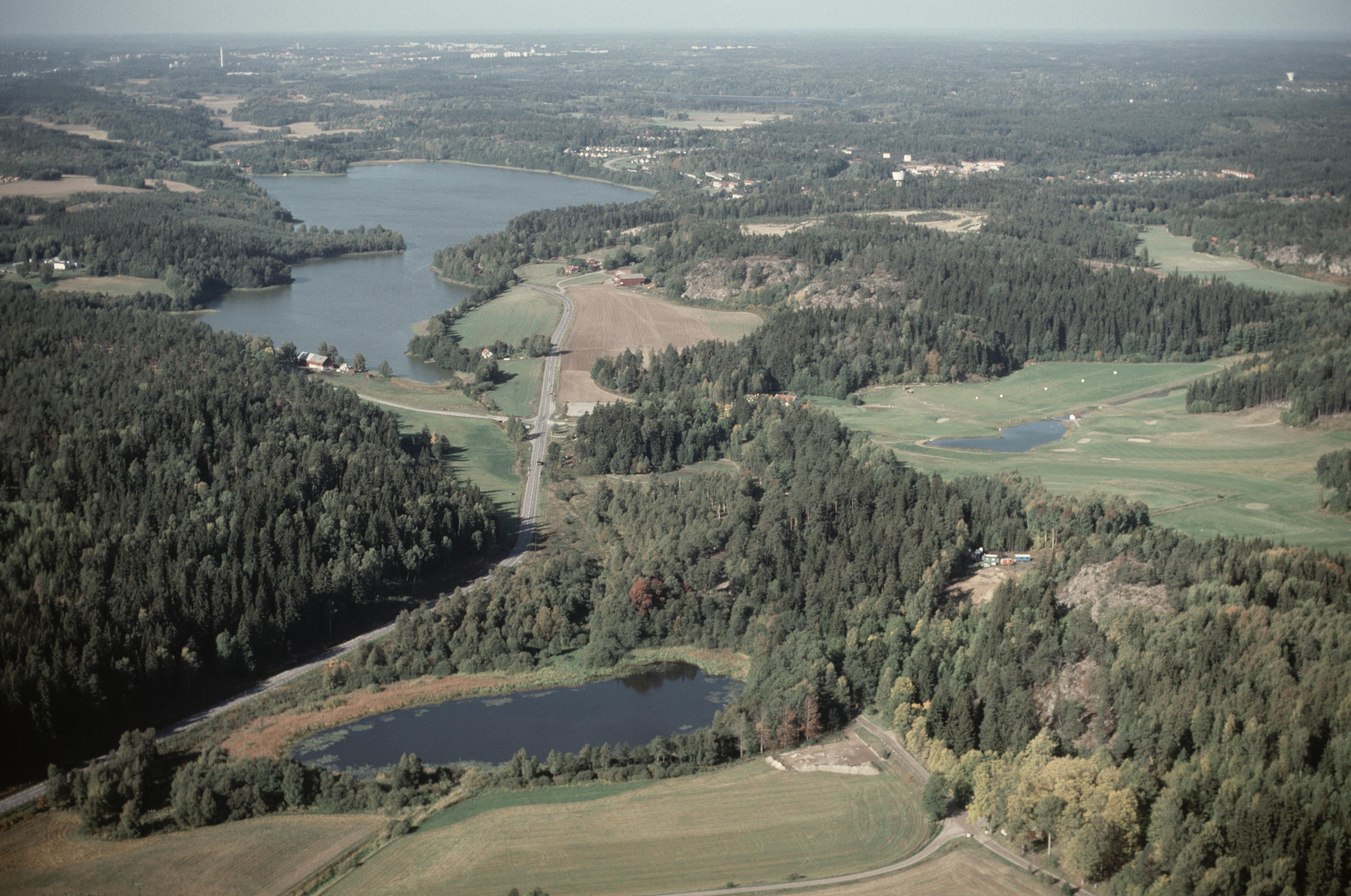 Arkeologisk undersökning innan järnvägen Grödingebanan byggs. Vid bildens mitt boplats RAÄnr Grödinge 477:1, 530:1, bytomt Grödinge 530:1 m.fl vid sjön Gölan och golfbanan vid Malmbro gård. Bilden är tagen mot (väderstreck): VNV