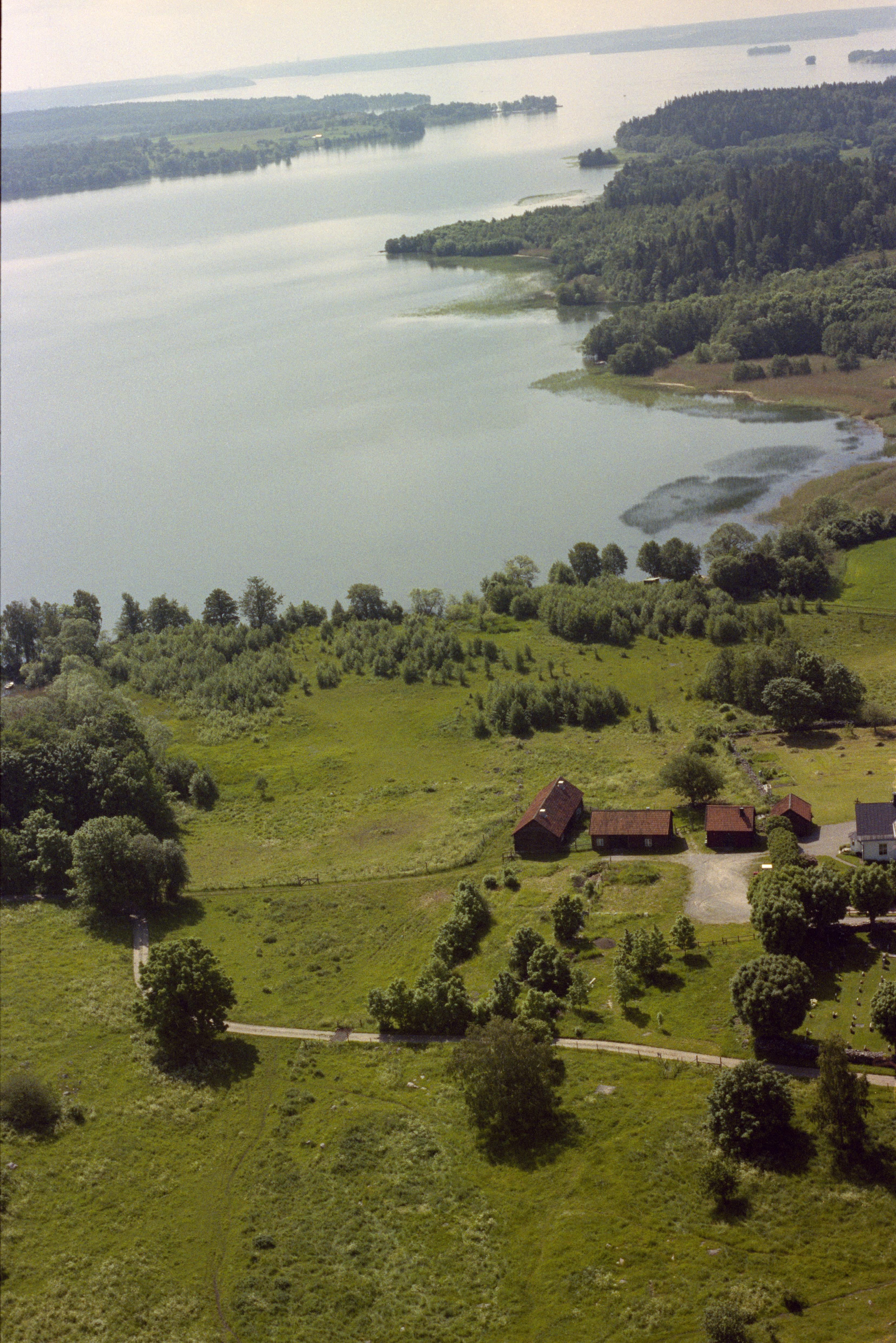 Fornlämningsområdet Hovgården RAÄnr Adelsö 46:2 på Adelsön vid Hovgårdsfjärden i Mälaren. Alsnö hus RAÄnr Adelsö 47:1, Adelsö kyrka, Kungshögarna Adelsö 48:1-6 m.fl. I bildens övre del ön Björkö-Birka. Bilden är tagen mot (väderstreck): S