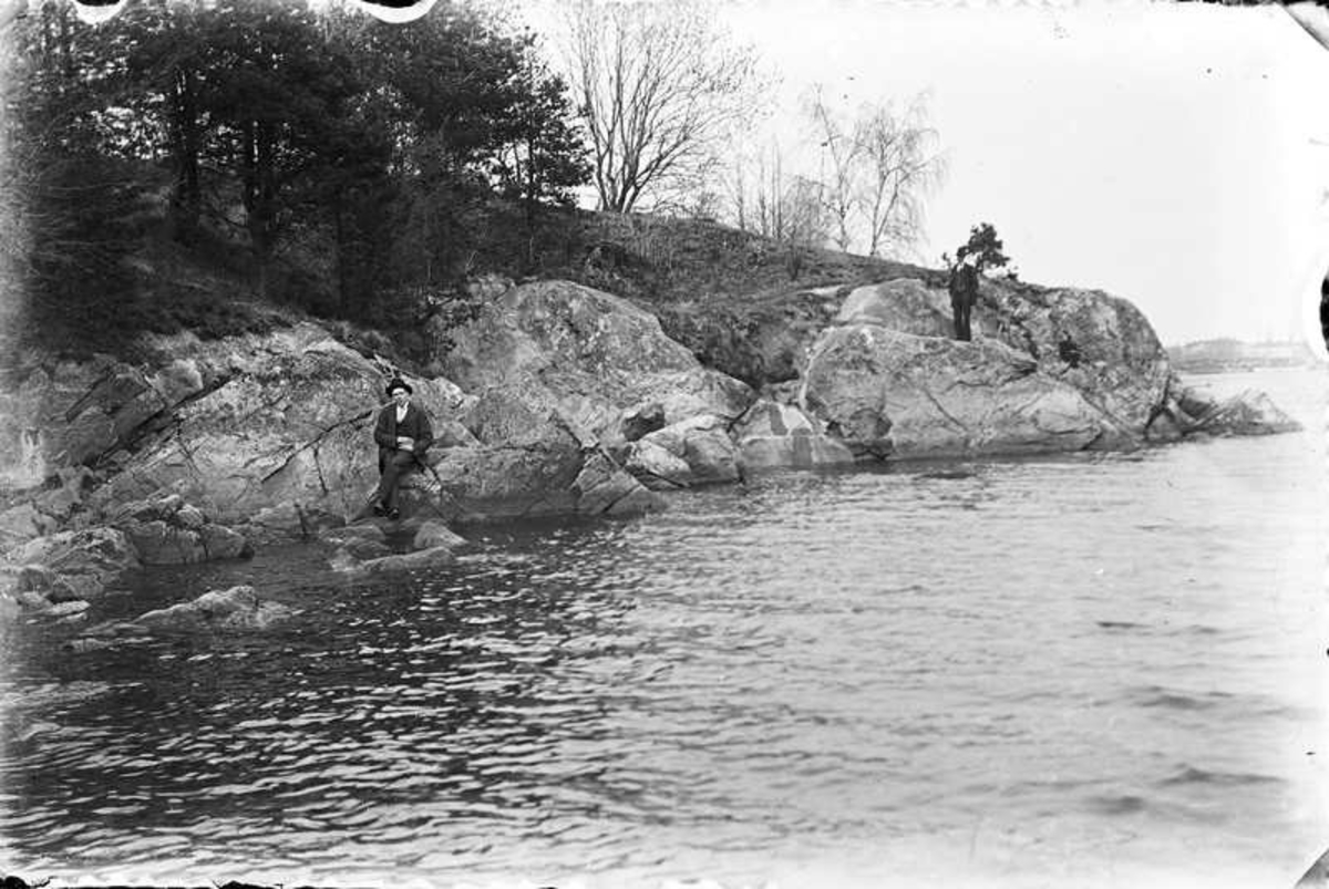 Två personer vid vattnet. Vänersborg skymtar i bakgrunden, så fotografiet är troligtvis taget från området runt Skaven.