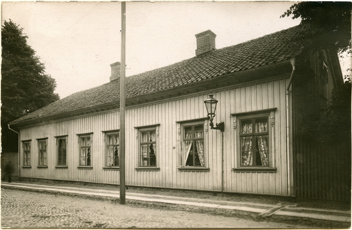 Emil Berggrens hus vid Kronogatan 7 i Vänersborg, fasad mot gatan. Från höger de två fönstren till förmaket med gaslyktan emellan, så de tre salsfönstren med reflexionsspegeln vid det första, därefter tamburfönstret och så två fönster till den dublett, som brukade hyras ut.