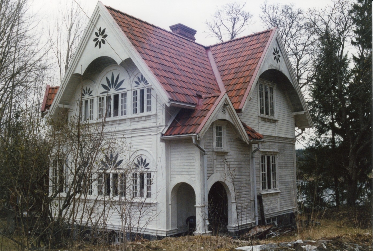 Vickerud, vitmålat trähus. Rörviken Nössemark Byggt av byggmästare Gustav Nilsson, omkring 1930.