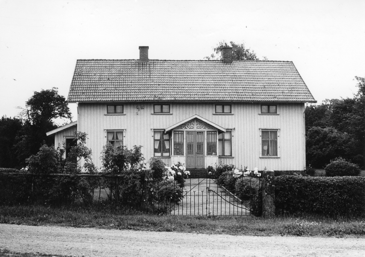 Trähus med inglasad veranda. Del av trädgård. Jordbruksfastighet. Ryninga Kölaby