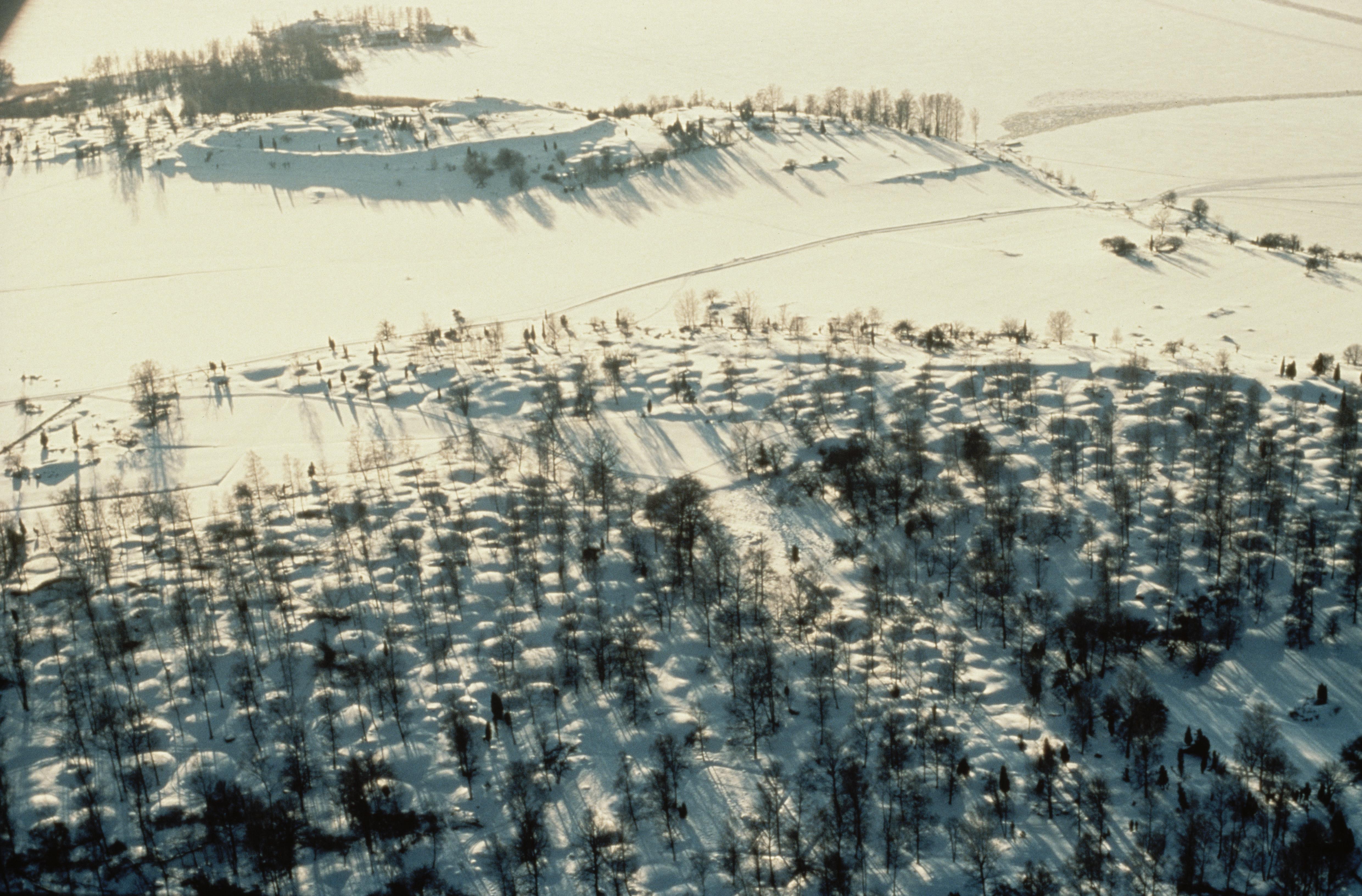Fornlämningsområdet Birka på Björkö i Mälaren. Norra delen av ön i området Hemlanden och Svarta jorden RAÄnr Adelsö 118:1 vid Stadsvallen Adelsö 119:1-2. Uppe till vänster gravfält Borgs hage RAÄnr Adelsö 35:1 och fornborg Borg Adelsö 34:1 vid Ångholmen. Bilden är tagen mot (väderstreck): SV