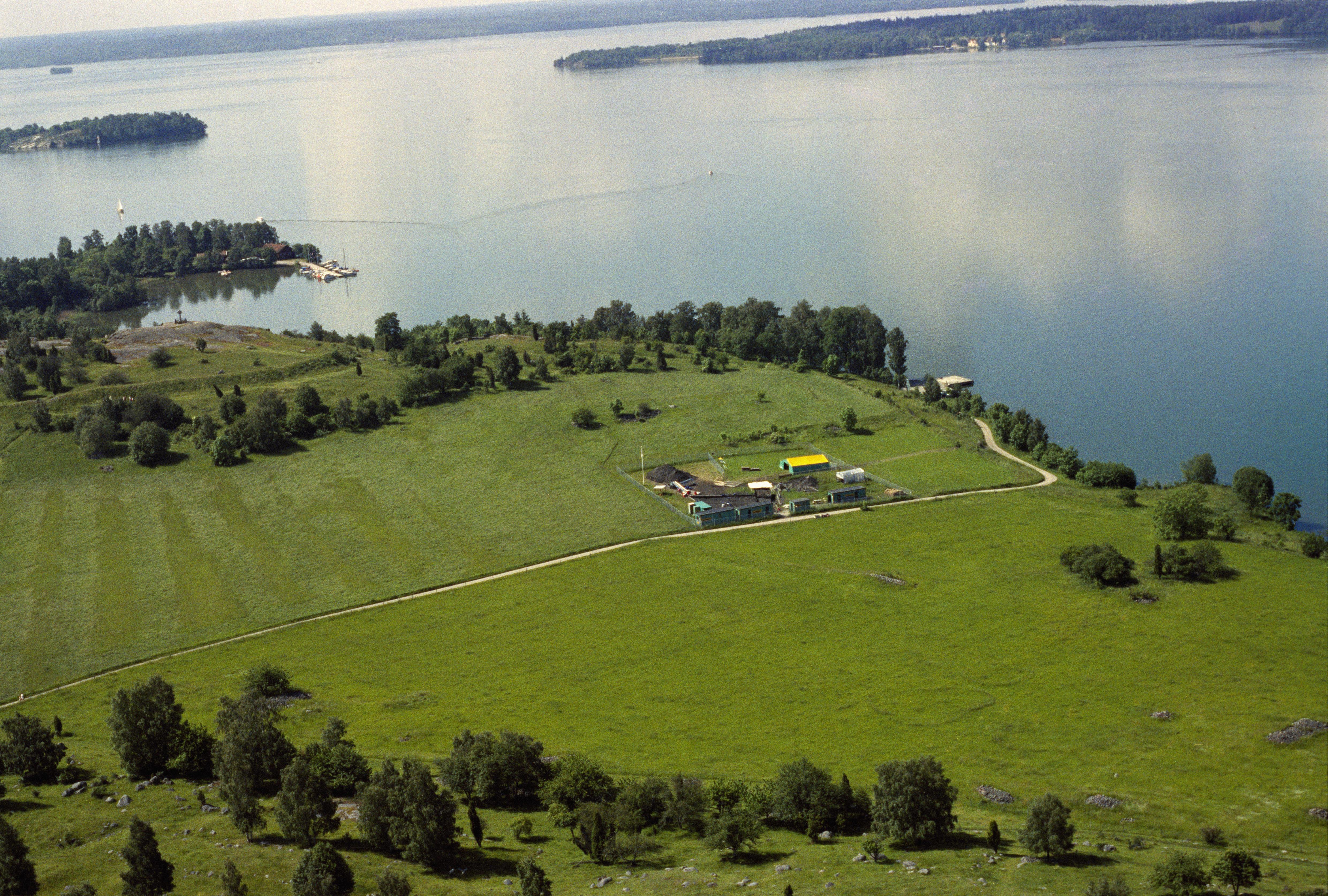 Fornlämningsområdet Birka på Björkö i Mälaren. Vid bildens mitt arkeologisk undersökning i bo- och gravplats Hemlanden och Svarta jorden RAÄnr Adelsö 118:1 vid Stadsvallen Adelsö 119:1-2. Uppe till vänster gravfält Borgs hage RAÄnr Adelsö 35:1 och fornborg Borg Adelsö 34:1 vid Ångholmen. Bilden är tagen mot (väderstreck): SV
