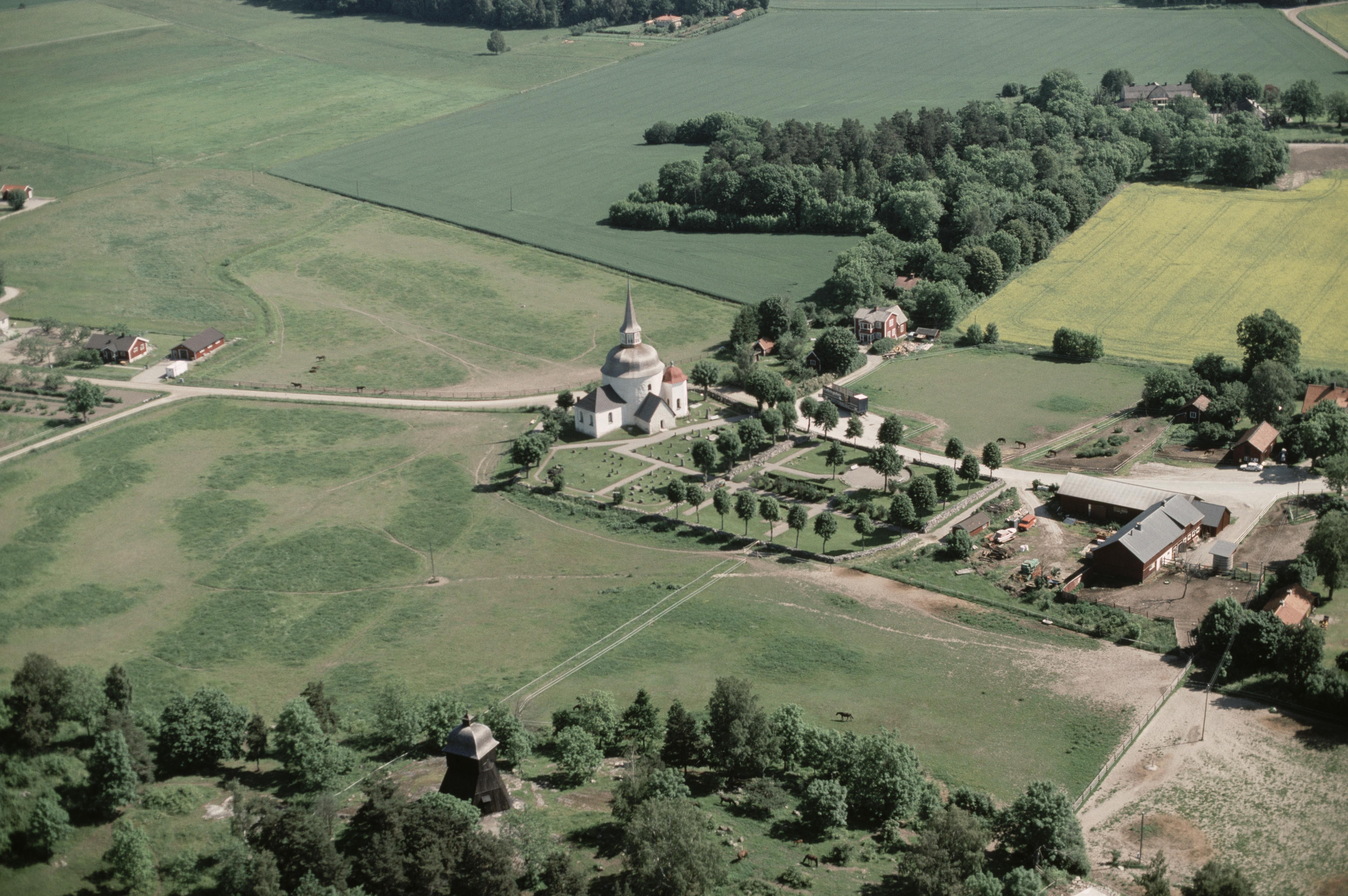 Munsön i Mälaren. Munsö kyrka vid bildens mitt. Nere till vänster fornlämningsområde vid Norrby med bytomt RAÄ Munsö 81:1, hög Munsö 49:1 m.fl. Bilden är tagen från (väderstreck): NO
