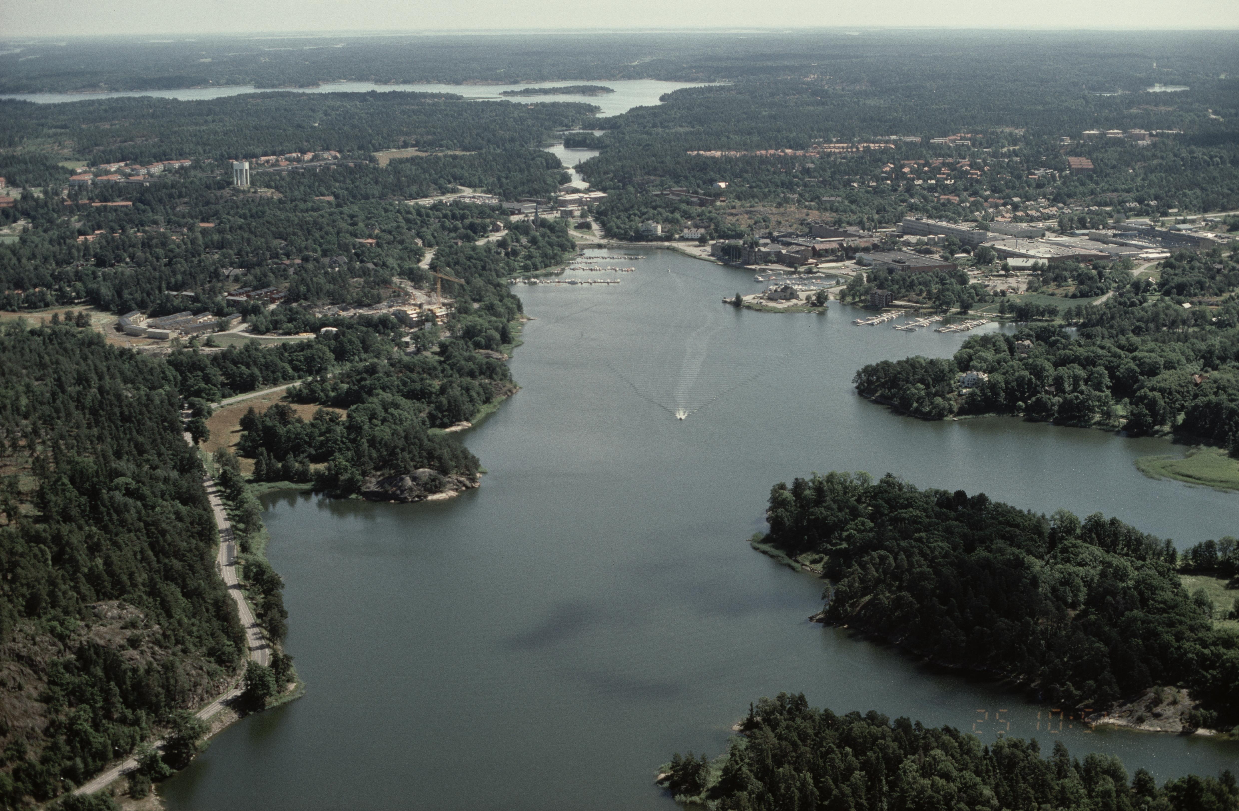 Gustavsbergs tätort vid Farstaviken. Gustavsbergs kyrka och porslinsfabrikerna uppe till höger. Bilden är tagen mot (väderstreck): Ö
